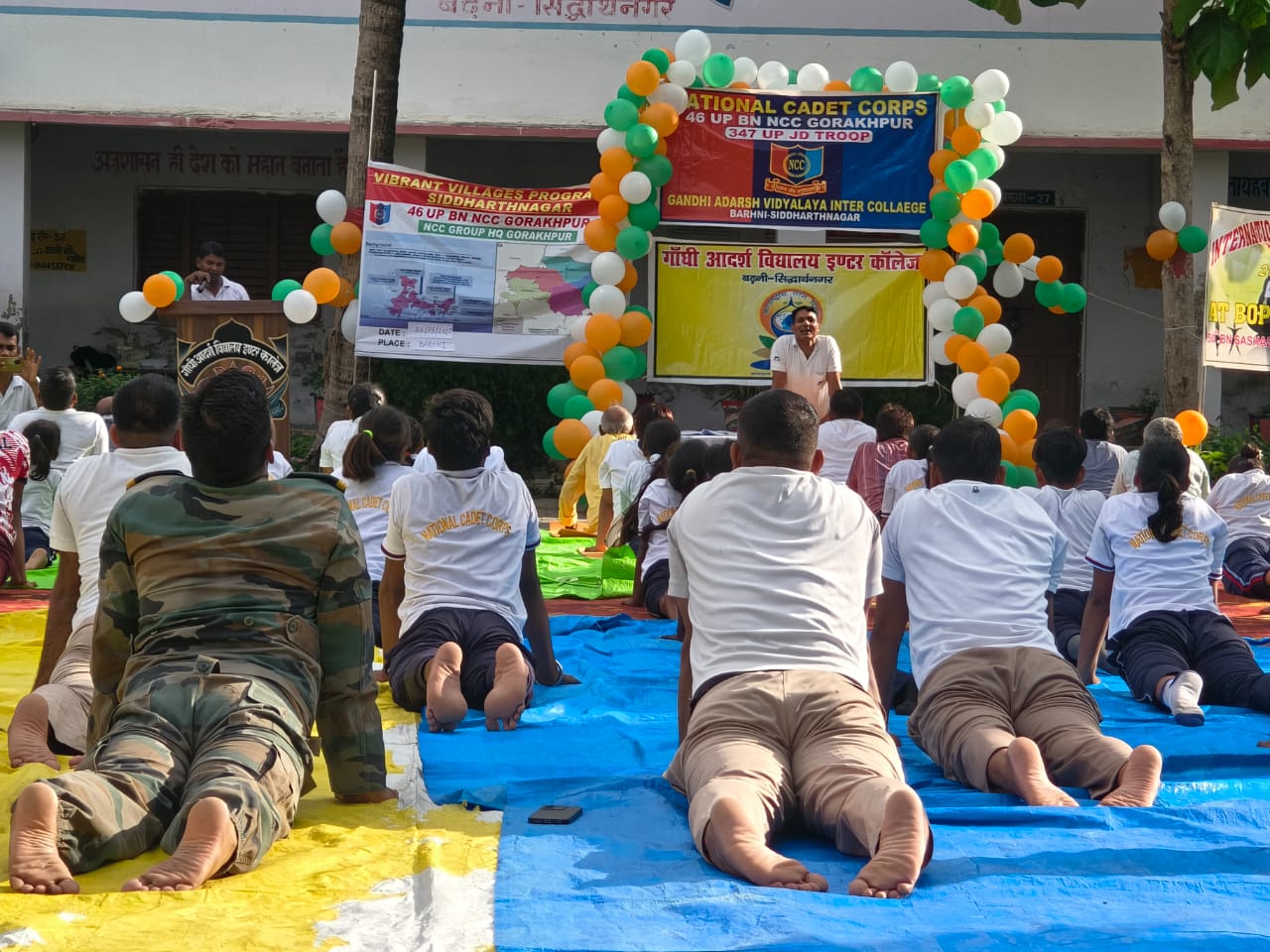 SIDHARTH NAGAR: 11वें अंतर्राष्ट्रीय योग दिवस के उपलक्ष्य में नगर पंचायत बढ़नी बाजार स्थित गांधी आदर्श विद्यालय इंटर कॉलेज में एक गरिमामय कार्यक्रम संपन्न हुआ। इस आयोजन में विद्यालय के शिक्षक, कर्मचारी तथा 46 यूपी बटालियन एनसीसी जूनियर डिवीजन के कैडेटों ने उत्साहपूर्वक भाग लिया।