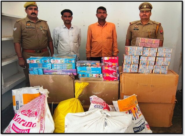 AURAIYA NEWS: अपर पुलिस महानिदेशक कानपुर जोन, कानपुर एवं पुलिस उप महानिरीक्षक कानपुर परिक्षेत्र, कानपुर के निर्देशन में अजीतमल पुलिस द्वारा की गयी कार्यवाही। सुरक्षित, सौम्य एवं दुर्घटनारहित दीपावली सम्पन्न कराने की शासन की मंशानुरुप एवं पुलिस अधीक्षक के निर्देशन मे जनपद के समस्त थाना क्षेत्रों में अवैध रुप से पटाखा निर्माण, भंडारण एवं विक्रय करने वालों के विरुद्ध विशेष अभियान के क्रम मे थाना अजीतमल पुलिस द्वारा शनिवार को दो अलग-अलग स्थानों से मुखबिर खास की सूचना पर दो अभियुक्तगण- राम जी व सूरज राजपूत को कुल 1 क्विंटल 85.5 किलोग्राम अवैध आतिशबाजी/पटाखों ( अनुमानित कीमत लगभग 1.5 लाख रूपये) सहित गिरफ्तार किया गया। पुलिस टीम द्वारा अभियुक्तगण से नाम पता पूछताछ की गयी तो बताया कि हमारे द्वारा आतिशवाजी/पटाखा का भंडारण किया था जिसको बेचकर लाभ कमाना चाहते थे.