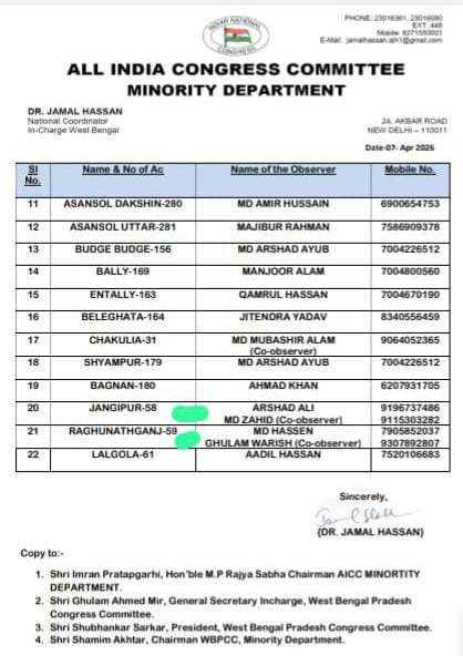 PRAYAGRAJ NEWS: अखिल भारतीय कांग्रेस कमेटी अल्पसंख्यक विभाग द्वारा 2026 विधानसभा चुनाव के लिए अरशद अली को जिला मुर्शीदाबाद के जंगीपुर 58 और मो हसीन को रधुनाथगंज 59 विधानसभा का पर्यवेक्षक (ऑब्जर्वर) नियुक्त कपर्यवेक्षक इसी क्रम में मो ज़ाहिद और गुलाम वारिस को Co-ordination बनाया गया है जिसके लिए अरशद अली ने कांग्रेस नेतृत्व और विशेष रूप से कांग्रेस महासचिव श्रीमती प्रियंका वाड्रा गाँधी जी एवं अल्पसंख्यक विभाग के राष्ट्रीय चेयरमैन एवं राज्यसभा सांसद जनाब इमरान प्रतापगढ़ी साहब, का आभार व्यक्त किया इस मौके पर बधाई देने वालो मे शहर अध्यछ फुजैल हाशमी वरिष्ठ पार्षद तस्लीम उद्दीन, बाबा अभय अवस्थी जी, हसीब अहमद,सुस्मिता यादव, तंज़िम् उद्दीन, विशाल सोनकर, हाज़ी सरताज,कामेश्वर सोनकर, महफूज अहमद, अहमद उल्ला,शकूर अहमद इस्तीयक् अहमद,कैफ वारशी, दरक्शा कुरैशी, निषाद फातमा, नफीस कुरेशी नौशे प्रधान, सैयद तारिक, अंजुन परवेज़, मो खालिद फिरोज जमाल तहा खान आदि।