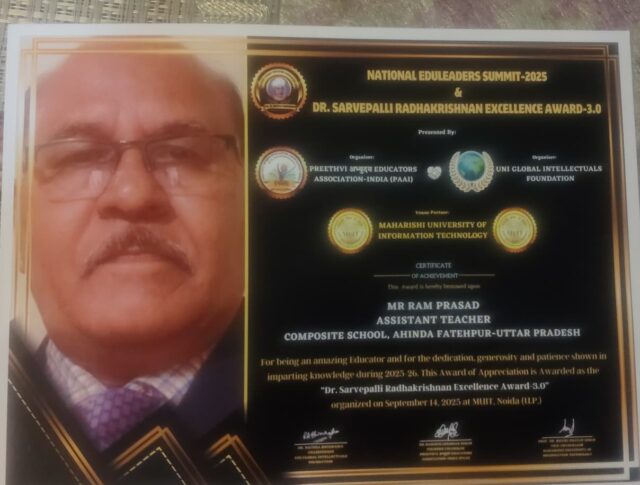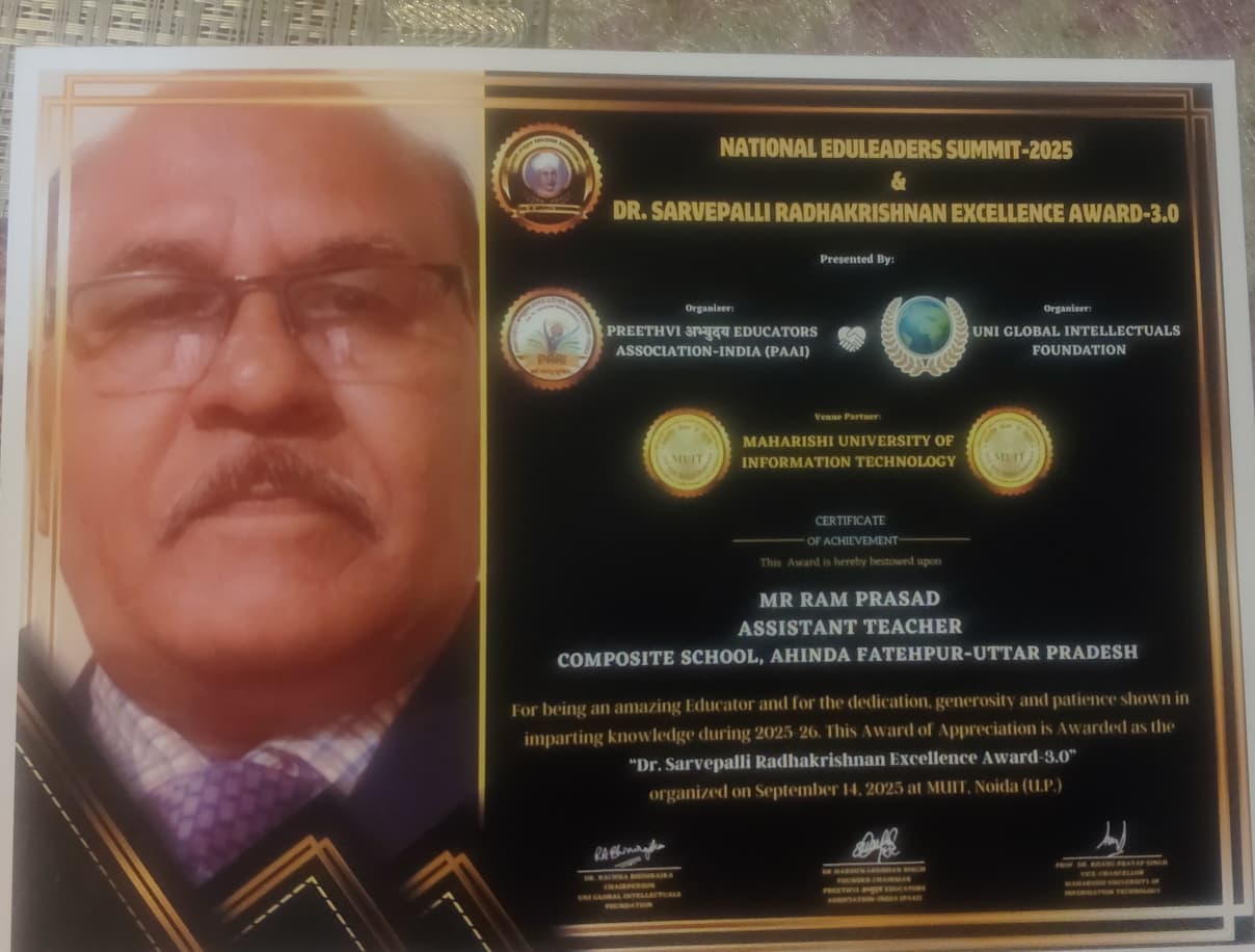 ऐसे ही शिक्षकों में सेना में सेवा दे चुके अहिंदा के शिक्षक राम प्रसाद पाल हैं जिन्हें महर्षि यूनिवर्सिटी नोएडा में आयोजित एक समारोह में उत्तराखंड के पूर्व मुख्यमंत्री राम तीर्थ रावत, केंद्रीय बोर्ड आफ एजुकेशन के ज्वाइंट डायरेक्टर आरपी सिंह एवं पृथ्वी अभ्युदय एजुकेटर एसोसिएशन के फाउंडर हर्षवर्धन ने संयुक्त रूप से डॉक्टर सर्वपल्ली अवार्ड से सम्मानित किया गया।खंड शिक्षा अधिकारी हथगाम नरेंद्र सिंह ने राम प्रसाद पाल को अवार्ड मिलने पर बधाई देते हुए कहा कि वे शिक्षा विभाग के गौरव हैं। इन्हें पहले भी शिक्षक रत्न पुरस्कार से सम्मानित किया जा चुका है। इस अवसर पर शिक्षण ने उन्हें बधाई दी है। कंपोजिट स्कूल अहिन्दा शिक्षा क्षेत्र हथगाम के शिक्षक रत्न राम प्रसाद पाल को डाक्टर सर्वपल्ली अवॉर्ड से महर्षि यूनिवर्सिटी नोएडा में पूर्व मुख्यमंत्री उत्तराखंड रामतीर्थ रावत, केंद्रीय बोर्ड ऑफ एजुकेशन ज्वाइंट डायरेक्टर आरपी सिंह एवं पृथ्वी अभ्युदय एजुकेटर एसोसिएशन के फाउंडर हर्ष वर्धन द्वारा सम्मानित किया गया। कंपोजिट विद्यालय अहिन्दा, शिक्षा क्षेत्र हथगाम तथा पूरे जनपद को गौरवान्वित करने वाले सम्मान प्राप्त शिक्षक सेना में भी अपनी महत्वपूर्ण सेवा दे चुके हैं।