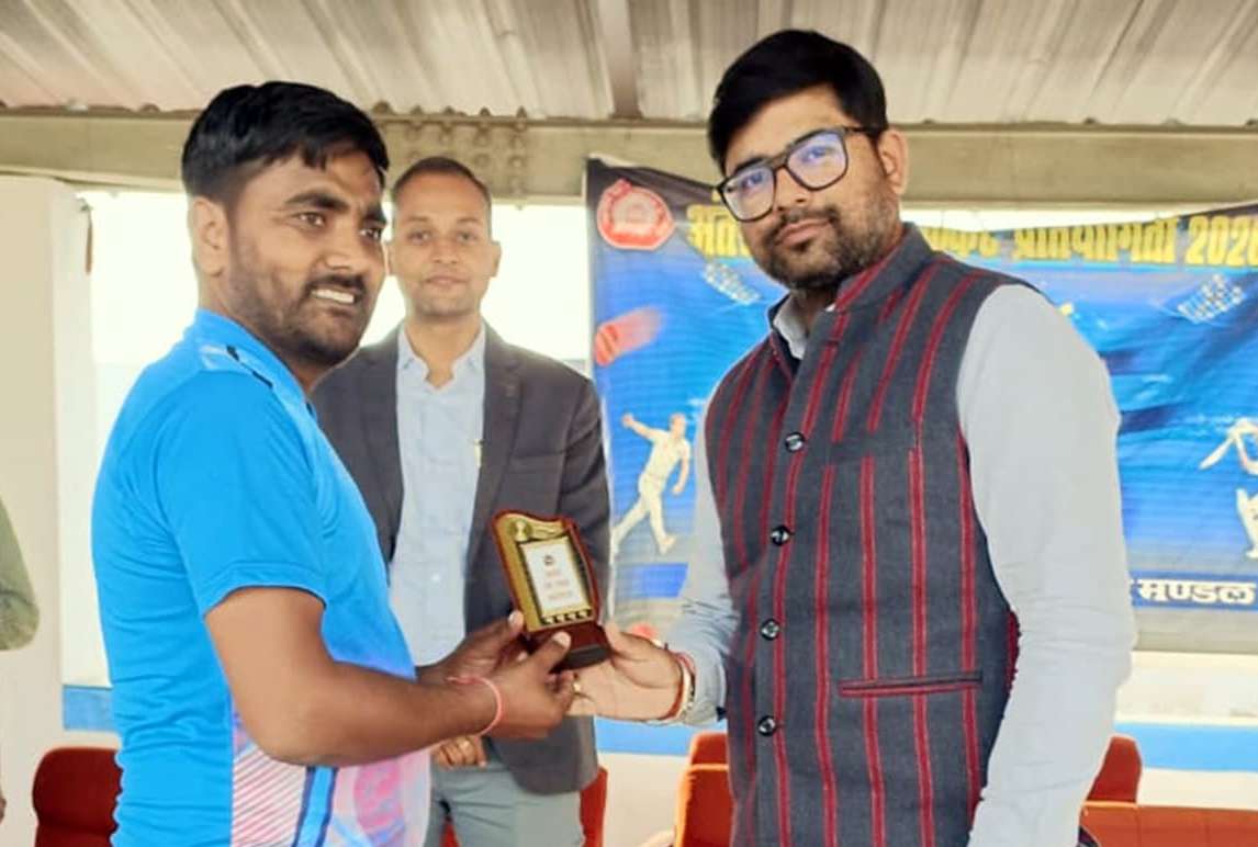 फोटो:डीआरएम कप में सुशील गुप्ता को मैन ऑफ द मैच देते रेलवे के अधिकारी आकाश श्रीनेत्र