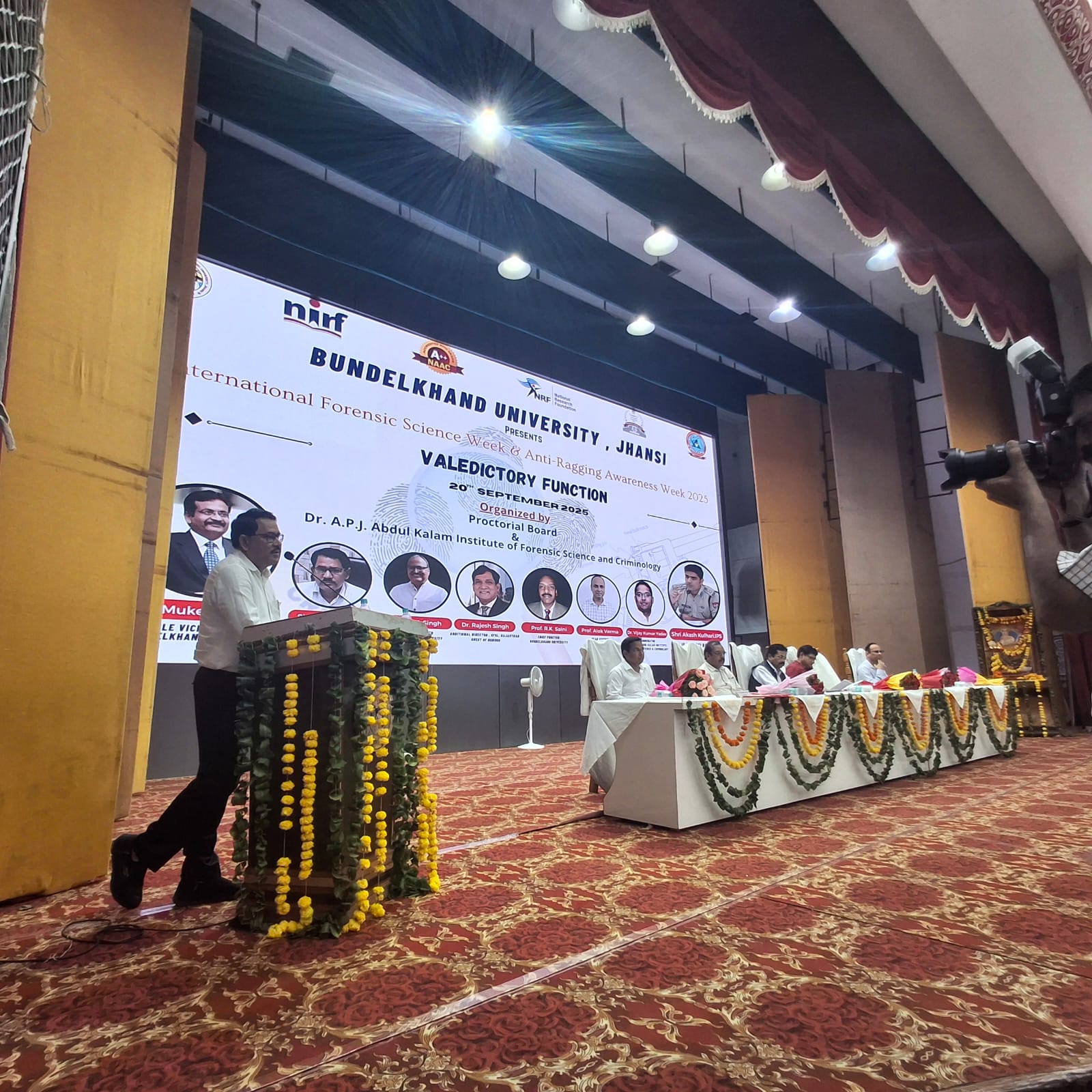 JHANSI NEWS: बुँदेलखंड विश्वविद्यालय के फॉरेंसिक विज्ञान विभाग में इंटरनेशनल फॉरेंसिक साइंस वीक एवं एंटी रैगिंग अवेयरनेस वीक के संयुक्त समापन समारोह का आयोजन किया गया। कार्यक्रम की अध्यक्षता कुलपति प्रो. मुकेश पाण्डेय ने की। उन्होंने अपने उद्बोधन में बताया कि विभाग में वर्तमान समय में देश के 24 राज्यों के विद्यार्थी अध्ययनरत हैं, जो विभाग की शैक्षणिक उपलब्धि का प्रमाण है। इस अवसर पर उन्होंने विभागाध्यक्ष को बधाई देते हुए इसी प्रकार उत्कृष्ट कार्य करते रहने की प्रेरणा दी। मुख्य कुलानुशासक प्रो. आर. के. सैनी ने विद्यार्थियों को एंटी रैगिंग संबंधी नियमों और उनके महत्व से अवगत कराया। उन्होंने बताया कि 12 अगस्त से 18 अगस्त तक विश्वविद्यालय स्तर पर एंटी रैगिंग वीक के अंतर्गत विभिन्न प्रतियोगिताएँ आयोजित की गईं। संकायाध्यक्ष ने विभाग में आयोजित गतिविधियों की जानकारी साझा की। विभागाध्यक्ष डॉ. विजय कुमार यादव ने सभी अतिथियों का स्वागत किया तथा फॉरेंसिक वीक के अंतर्गत आयोजित कार्यक्रमों का संक्षिप्त विवरण प्रस्तुत किया।कार्यक्रम के मुख्य अतिथि डॉ. राजेश सिंह, एडिशनल डायरेक्टर, फॉरेंसिक साइंस लेबोरेटरी, जयपुर ने विद्यार्थियों को DNA आधारित क्राइम सीन इन्वेस्टिगेशन के विषय में जानकारी दी तथा महत्त्वपूर्ण साक्ष्य प्रस्तुत करते हुए छात्रों में फॉरेंसिक साइंस के प्रति गहन रुचि एवं जागरूकता उत्पन्न की। बेसिक शिक्षा अधिकारी विपुल शिव सागर ने भी विभाग को शुभकामनाएँ दीं और ऐसे कार्यक्रमों को विद्यार्थियों के सर्वांगीण विकास के लिए आवश्यक बताया। कार्यक्रम के अंत में फॉरेंसिक वीक एवं एंटी रैगिंग वीक के अंतर्गत आयोजित विभिन्न प्रतियोगिताओं में भाग लेने वाले विद्यार्थियों को पुरस्कृत किया गया।इस अवसर पर विशेष रूप से डॉ. प्रकाश चन्द्र, डॉ. शुभांगी निगम, डॉ. आकाश कुमार, डॉ. मुरली मनोहर यादव, चंदन नामदेव, डॉ. ममता सिंह, डॉ. ज्योति मिश्रा, डॉ. प्रशांत मिश्रा तथा डॉ. संतोष पांडे उपस्थित रहे।