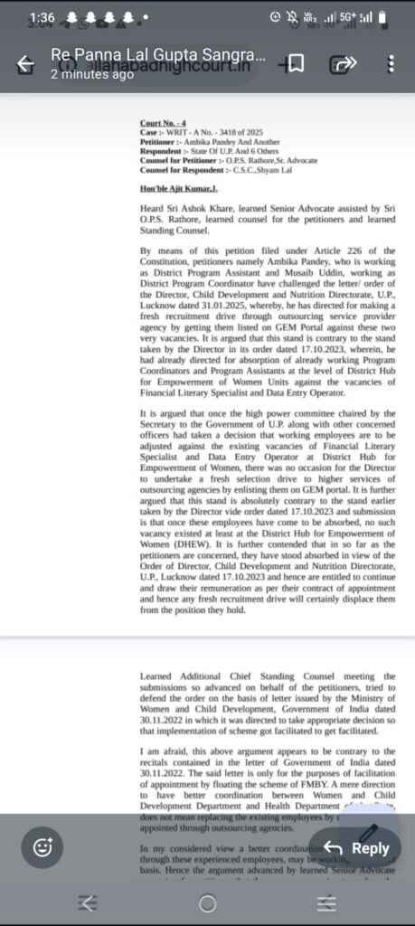 निदेशक महिला कल्याण विभाग लखनऊ ने 2023 में उक्त कर्मियों के समायोजन संबंधी आदेश की सूचना सभी जिला प्रोबेशन अधिकारी को पत्र भेजकर अवगत कराया। साथ ही मानदेय भुगतान करने हेतु बजट भी जारी कर दिया। जिसके आधार पर जिला प्रोबेशन अधिकारी ने जून 2023 से जुलाई 2024 तक मानदेय संविदा के आधार पर भुगतान किया है। लेकिन अक्टूबर 2024 में निदेशक महिला कल्याण विभाग लखनऊ ने उक्त पदों पर आउटसोर्स से भर्ती किए जाने का आदेश सभी जिलाधिकारी को दे दिया। आउटसोर्स से भर्ती किए जाने के खिलाफ प्रधानमंत्री मातृ वंदना योजना के कर्मियों ने उच्च न्यायालय इलाहाबाद में याचिका दाखिल कर उक्त पदों को संविदा पर यथावत बनाए रखने एवं बकाया मानदेय का भुगतान संविदा के आधार पर करने की मांग किया।जिस पर उच्च न्यायालय इलाहाबाद ने दोनों पक्षों की लंबी सुनवाई के बाद फाइनेंस लिट्रेसी एवं डाटा इंट्री ऑपरेटर को पद को आउटसोर्स से नियुक्ति पर रोक लगाते हुए संविदा पर यथावत बनाए रखने एवं बकाया मानदेय का भुगतान संविदा के आधार पर देने एवं आगे का कार्य संविदा के आधार पर लेने का आदेश दिया है।