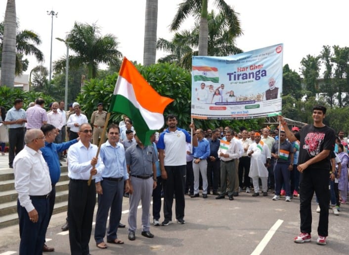 PRAYAGRAJ NEWS: मंगलवार को स्वतंत्रता दिवस-2025 के उपलक्ष्य में आयोजित हो रहे “हर घर तिरंगा” कार्यक्रम के अंतर्गत उत्तर मध्य रेलवे मुख्यालय में महाप्रबंधक उत्तर मध्य रेलवे उपेंद्र चंद्र जोशी द्वारा उत्तर मध्य रेलवे मुख्यालय से राष्ट्रीय ध्वज लहराकर तिरंगा रैली का शुभारंभ किया गया। हर घर तिरंगा अभियान के अंतर्गत आयोजित इस रैली को संगम परिसर उत्तर मध्य रेलवे मुख्यालय से रवाना किया गया और यह रैली मुख्यालय के साथ ही धूमनगंज-झलवा मार्ग से होकर रेलगांव कॉलोनी होते हुए वापस मुख्यालय में समाप्त हुई। इस रैली के माध्यम से रेल कर्मचारियों और आमजन को जागरूक किया गया l इस अवसर पर रैली में वंदे मातरम और भारत माता की जय आदि नारों का प्रतिभागी कर्मियों ने पूरे उत्साह के साथ उदघोष किया। इस अवसर पर हर घर तिरंगा के सेल्फी प्वाइंट पर महाप्रबंधक सहित सभी विभागाध्यक्षों एवं अन्य अधिकारियों तथा कर्मचारियों ने फोटो खिंचवाई। ज्ञात हो कि, वर्तमान वर्ष में हर घर तिरंगा अभियान 3 चरणों में आयोजित किया जा रहा | प्रथम चरण 2 से 8 अगस्त तक, दूसरा चरण 8 से 12 अगस्त और तीसरा चरण 12 से 15 अगस्त तक आयोजित हो रहा है। इस दौरान जागरूकता रैली, तिरंगा रैली, सांस्कृतिक कार्यक्रम समेत अन्य कार्यक्रम आयोजित किए जा रहे है। आजादी के आंदोलन में तिरंगे की आन-बान और शान के लिए लाखों क्रांतिकारियों ने अपना बलिदान दिया। हर घर तिरंगा अभियान के माध्यम से ऐसे महान क्रांतिकारियों को नमन करने के साथ-साथ देश भक्ति की भावना को बढ़ाने का काम किया जा रहा है। हर घर तिरंगा अभियान का उद्देश्य लोगों के मन में देशभक्ति की भावना जगाना और जन भागीदारी की भावना के साथ इस अभियान को सफल बनाना है। साथ ही स्टेशनों पर डिजिटल स्क्रीन, पोस्टर एवं बैनर,सेल्फी के माध्यम से हर घर तिरंगा अभियान के बारे में आमजन को जागरूक करते हुये उन्हें राष्ट्र के सम्मान में घरों पर तिरंगा फहराने के लिये प्रेरित भी किया जा रहा है। आज की इस रैली में अपर महाप्रबंधक जे एस लाकरा, अध्यक्ष उत्तर मध्य रेलवे खेल संघ एस पी द्विवेदी सहित अन्य प्रधान विभागाध्यक्ष एवं अन्य अधिकारी / कर्मचारी आदि ने उत्साहपूर्वक सहभागिता की रहे।