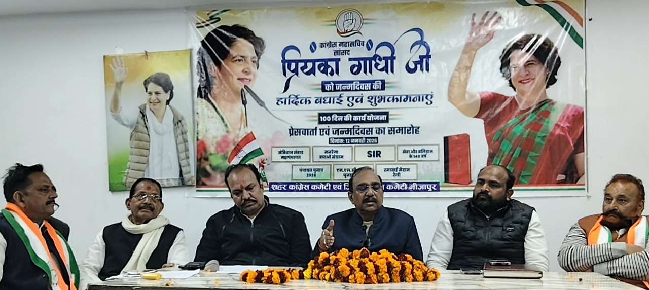 MIRZAPUR NEWS: अखिल भारतीय कांग्रेस कमेटी की राष्ट्रीय महासचिव प्रियंका गांधी वाड्रा के जन्मदिन के अवसर पर बाजीराव कटरा में केक काटकर उन्हें बधाई दी गई। इसके बाद आयोजित प्रेसवार्ता में जोनल कोऑर्डिनेटर व AICC सदस्य अनिल श्रीवास्तव ने कांग्रेस की आगामी 100 दिनों की कार्ययोजना की घोषणा की। अनिल श्रीवास्तव ने कहा कि भाजपा मनरेगा के कानूनी अस्तित्व को कमजोर करने और एसआईआर के जरिए मतदाताओं के नाम काटने की साजिश कर रही है, जिसे कांग्रेस सफल नहीं होने देगी। उन्होंने बताया कि अगले 100 दिनों में प्रदेशभर में संविधान संवाद महापंचायत, मनरेगा बचाओ संग्राम, एसआईआर की निगरानी, पंचायत चुनाव 2026 की तैयारी और संगठन सृजन अभियान को तेज किया जाएगा। उन्होंने बताया कि 24 जनवरी 2026 से सीतापुर से संविधान संवाद महापंचायत की शुरुआत होगी। साथ ही कांग्रेस पार्टी मनरेगा मजदूरों की न्यूनतम मजदूरी 400 रुपये सुनिश्चित कराने के लिए जनआंदोलन करेगी। नवंबर 2026 में होने वाले एमएलसी चुनावों में भी पार्टी पूरी मजबूती से उतरेगी। प्रेसवार्ता में जिलाध्यक्ष डॉ. अरविंद किशोर राय, शहर अध्यक्ष डॉ. शिवकुमार सिंह पटेल, भगवान दत्त पाठक, शिवशंकर चौबे, दीपचंद्र जैन, मिन्हाज अहमद, अर्चना चौबे, राजधर दुबे, अंकुर श्रीवास्तव, राजेंद्र विश्वकर्मा, इमरान खान, शबनम अंसारी, अशोक गुप्ता सहित अन्य कांग्रेस पदाधिकारी व कार्यकर्ता उपस्थित रहे।