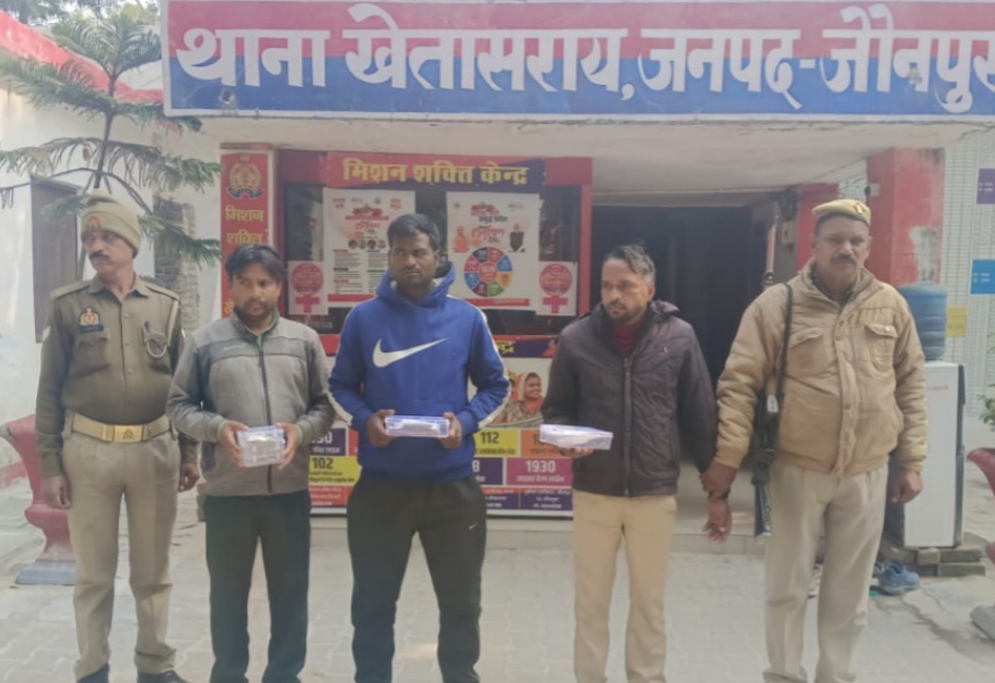 JAUNPUR NEWS: जौनपुर के थाना खेतासराय पुलिस ने टप्पेबाजी की हालिया घटना में त्वरित कार्रवाई करते हुए सिर्फ 24 घंटे में पंजीकृत मुकदमे का सफल अनावरण कर तीन वांछित अभियुक्तों को गिरफ्तार कर महत्वपूर्ण सफलता हासिल की है। यह कार्रवाई *थानाध्यक्ष प्रदीप कुमार सिंह* के कुशल निर्देशन में की गई, जिसमें पुलिस टीम ने सीसीटीवी फुटेज और मुखबिर की सटीक सूचना के आधार पर आरोपितों तक पहुंच बनाई। मामला दिनांक 02.12.2025 को घटित टप्पेबाजी से जुड़ा है, जिसकी सूचना आवेदिका द्वारा 09.12.2025 को दी गई थी। इस संबंध में मु.अ.सं. 245/2025, धारा 316(2)/318(4) बीएनएस* के तहत मामला पंजीकृत हुआ था। जांच के दौरान पुलिस ने आज 10.12.2025 को रेलवे स्टेशन खेतासराय के पीछे आईडियल स्कूल के पास से समय लगभग 8:30 बजे