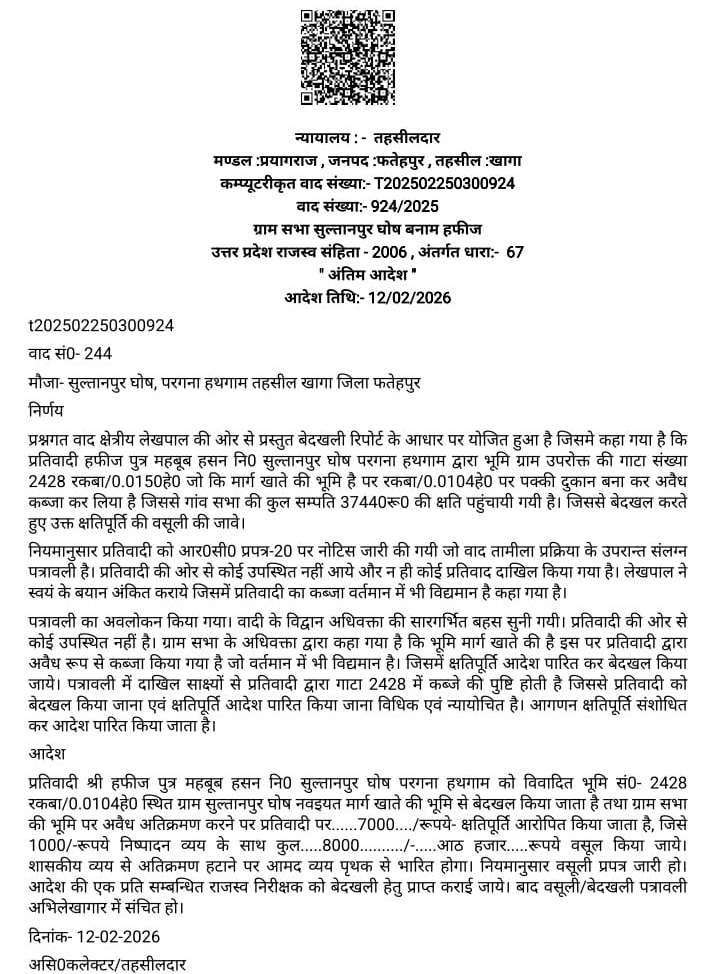 FATEHPUR NEWS: तहसीलदार न्यायालय, खागा द्वारा सुल्तानपुर घोष गांव में ग्राम सभा की भूमि पर अवैध कब्जे के मामलों में हफीज पुत्र महबूब हसन दो अलग-अलग अंतिम आदेश जारी करते हुए आरोपित के खिलाफ बेदखली और जुर्माने की कार्रवाई के निर्देश दिए गए हैं। दोनों मामलों में राजस्व टीम की रिपोर्ट और साक्ष्यों के आधार पर कब्जा साबित पाया गया। पहला मामला वर्ष 2022 के वाद संख्या 2982/2022 से संबंधित है, जिसमें आदेश दिनांक 01 मई 2024 को पारित किया गया। न्यायालय ने पाया कि ग्राम सभा सुल्तानपुर घोष की गाटा संख्या 2425 (बंजर खाते की भूमि) पर आरोपित द्वारा दुकान बनाकर अवैध कब्जा किया गया था। इस कब्जे से ग्राम सभा को लगभग 68,000 रुपये की क्षति हुई। न्यायालय ने कब्जा हटाने के साथ 25,000 रुपये क्षतिपूर्ति और 1,000 रुपये व्यय सहित कुल 26,010 रुपये की वसूली का आदेश दिया। दूसरा मामला वाद संख्या 924/2025 से संबंधित है, जिसमें 12 फरवरी 2026 को अंतिम आदेश पारित हुआ। इसमें गाटा संख्या 2428 (मार्ग खाते की भूमि) पर पक्की दुकान बनाकर कब्जा करने की पुष्टि हुई। इस प्रकरण में ग्राम सभा को लगभग 37,440 रुपये की क्षति आंकी गई। न्यायालय ने बेदखली के साथ 7,000 रुपये क्षतिपूर्ति और 1,000 रुपये व्यय सहित कुल 8,000 रुपये वसूली के निर्देश दिए। दोनों मामलों में यह भी उल्लेख किया गया कि आरोपित की ओर से कोई संतोषजनक जवाब या आपत्ति प्रस्तुत नहीं की गई, जबकि लेखपाल की रिपोर्ट और प्रस्तुत साक्ष्यों से कब्जा स्पष्ट रूप से प्रमाणित हुआ। तहसीलदार न्यायालय ने संबंधित राजस्व निरीक्षक को आदेश की प्रति भेजते हुए तत्काल कब्जा हटाने, वसूली सुनिश्चित करने और अभिलेखागार में कार्रवाई दर्ज करने के निर्देश दिए हैं। इस मामले में उपजिलाधिकारी खागा अभिनीत कुमार द्वारा बताया गया कि मामले की गंभीरता से जांच कराकर आवश्यक कार्यवाही कराई जाएगी।