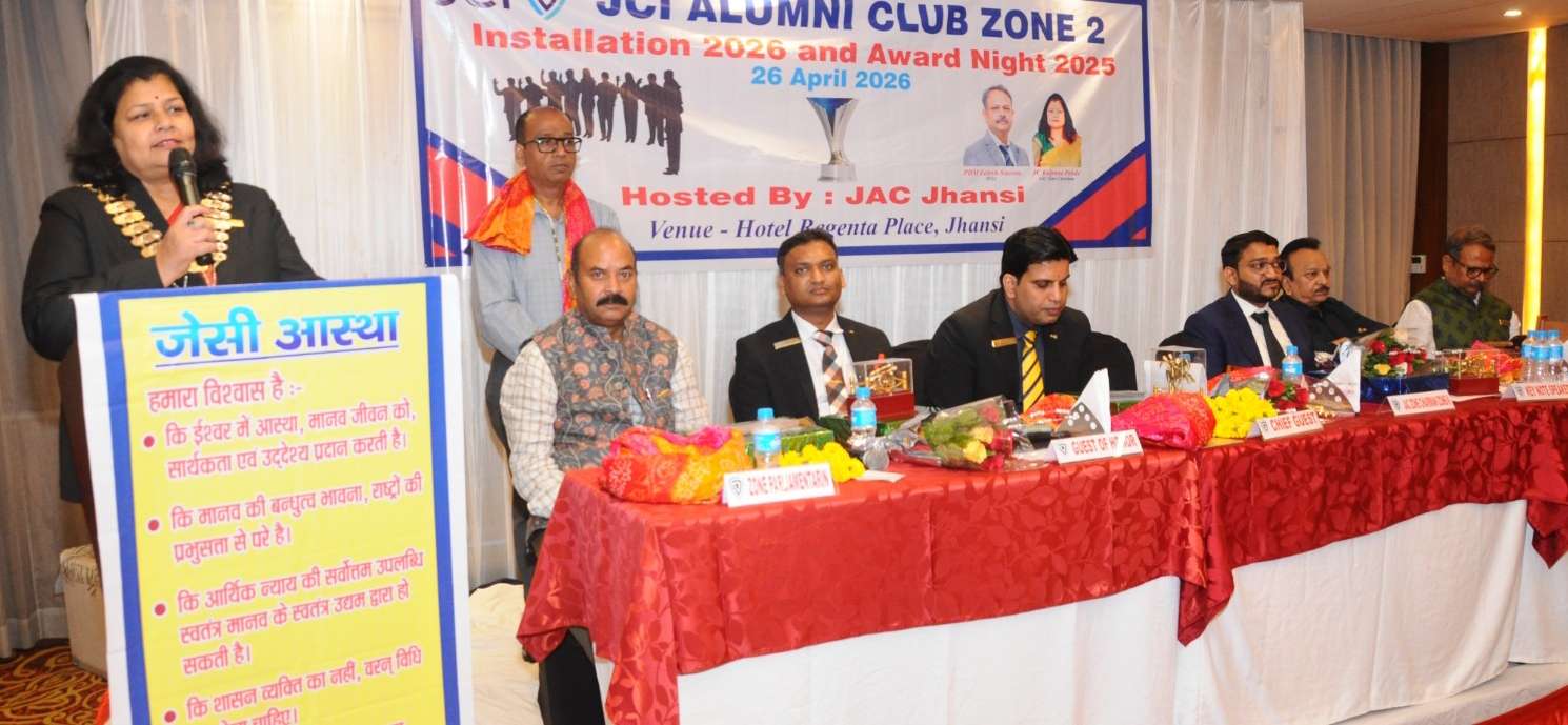 JHANSI NEWS: होटल रीजेंटा पैलेस में जेसीआई एलुमिनाई क्लब जोन-2 का अधिष्ठापन समारोह एवं अवार्ड नाइट गरिमामय वातावरण में सम्पन्न हुआ। कार्यक्रम की अध्यक्षता वर्ष 2025 के जोन चेयरमेन जेसी ललेश सक्सेना ने की। कार्यक्रम की शुरुआत जेसी डॉ. प्रदीप श्रीवास्तव द्वारा जेसी आस्था के वाचन से हुई। इसके पश्चात मंचासीन अतिथियों का पुष्पगुच्छ व माल्यार्पण कर स्वागत किया गया। सभी अतिथियों ने दीप प्रज्वलन कर भगवान श्री गणेश के चित्र पर माल्यार्पण किया। सौम्या ने गणेश वंदना पर आकर्षक नृत्य प्रस्तुत कर कार्यक्रम को आध्यात्मिक रंग दिया। जेसी राजेश शर्मा ने अभिनंदन भाषण प्रस्तुत किया। सत्र 2026-27 की जोन चेयरमेन जेसी डॉ. कल्पना पांडे का परिचय जेसी प्रीति नेवालकर ने कराया। निवर्तमान जोन चेयरमेन ललेश सक्सेना ने डॉ. कल्पना पांडे को पद एवं गोपनीयता की शपथ दिलाई तथा कॉलर पहनाकर औपचारिक रूप से दायित्व सौंपा। अपने स्वीकृति भाषण में जोन चेयरमेन डॉ. कल्पना पांडे ने जेसीज के सिद्धांतों के अनुरूप कार्य करने की प्रतिबद्धता व्यक्त की। वरिष्ठ क्षेत्रीय पदाधिकारी जेसी तरुण सक्सेना ने मार्गदर्शन दिया। इसके बाद बोर्ड एवं नए सदस्यों को शपथ ग्रहण कराई गई।