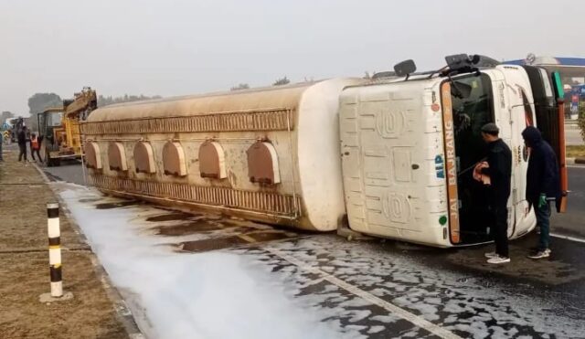 टायर फटने से मैथिल एसिड टैंकर पलटावाहन अनियंत्रित होकर डिवाइडर से टकराया