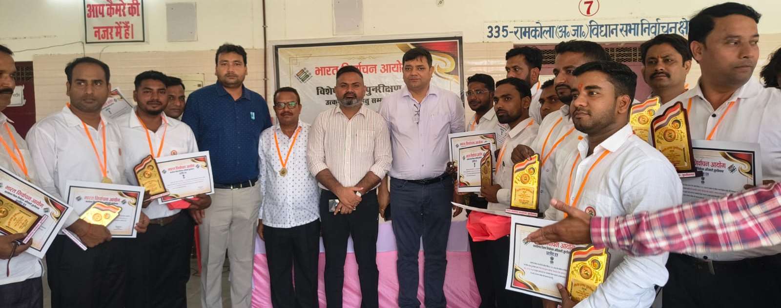 वीआरसी ऑपरेटर राजन कुमार मद्धेशिया (केंद्र 329-खड्डा), इस्तेयाक (केंद्र 329-खड्डा),सलाउद्दीन अंसारी (केंद्र 330-पडरौना), शैलेश कुशवाहा (केंद्र 330-पडरौना),मनोज कुमार सिंह (केंद्र 331-तमकुहीराज) ,बृजेश कुमार राय (केंद्र 331-तमकुहीराज), अनित कुमार मौर्य (केंद्र 332-फाजिलनगर), बबलू चौधरी (केंद्र 333-कुशीनगर) किशन कुमार मद्धेशिया (केंद्र 333- कुशीनगर), अरविन्द कुमार गौतम (केंद्र 334- हाटा),सुश्री मनोरमा शर्मा (केंद्र 334-हाटा),भरत प्रसाद (केंद्र 335-रामकोला),सुधीर प्रसाद (केंद्र 335-रामकोला) इस अवसर पर उप जिला निर्वाचन अधिकारी वैभव मिश्रा, उप जिलाधिकारी/सहायक निर्वाचन अधिकारी मु0 जफर सहित निर्वाचन कार्यालय के समस्त अधिकारी एवं कर्मचारी उपस्थित रहे।