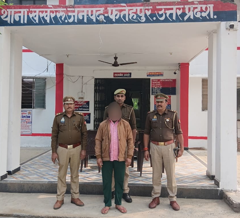 FATEHPUR NEWS: पुलिस अधीक्षक अनूप कुमार सिंह के निर्देशन में अपराधियों की गिरफ्तारी के लिए चलाए जा रहे विशेष अभियान के तहत थाना खखरेरू पुलिस को बड़ी सफलता मिली है। डकैती के मामले में वांछित चल रहा 25,000 रुपये का इनामिया आरोपी को पुलिस ने गिरफ्तार कर लिया। थाना खखरेरू पुलिस ने गुरुवार को मु.अ.सं.–177/2025 धारा 126(2), 115(2), 310(2), 351(3), 317(3) बीएनएस व 66डी आईटी एक्ट से संबंधित मुकदमे में फरार चल रहे आरोपी ओमवीर सिंह उर्फ मेहमान पुत्र सोनेलाल, निवासी लौंगपुर, थाना सिरपुड़ा, जनपद कासगंज (उम्र लगभग 40 वर्ष) को गिरफ्तार कर न्यायालय रवाना किया गया। इस दौरान मुलजिम के पास से 670 रुपए नगद बरामद हुए  गिरफ्तारी करने वाली टीम में थानाध्यक्ष विद्याप्रकाश सिंह, वरिष्ठ उप निरीक्षक श्यामसुन्दर गिरि, उप निरीक्षक अमित कुमार शर्मा, आरक्षी दीपक कुमार, अजीत कुमार एवं अरुण यादव मौजूद रहे हैं।