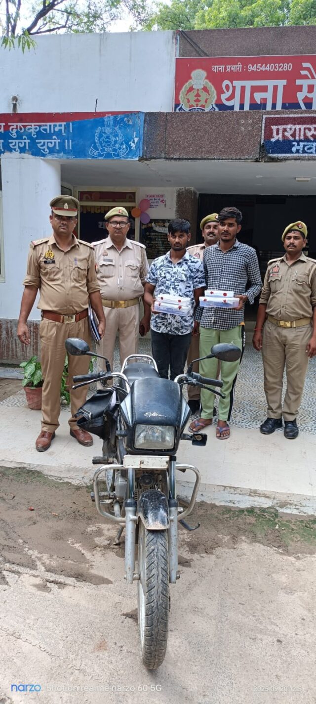 ETAWA NEWS: थाना पुलिस ने शनिवार की सुबह अनैया नदी से पहले खुशालपुर मोड़ पर चेकिंग अभियान के दौरान दो युवकों को दबोच लिया। आरोपियों के पास से तमंचा, कारतूस, चोरी की बाइक, मोबाइल फोन और छुरी बरामद हुई। पुलिस का कहना है कि दोनों अभियुक्त आपराधिक गतिविधियों में लिप्त थे और चोरी की मोटरसाइकिल पर सवार होकर किसी घटना को अंजाम देने की फिराक में थे। बरामदगी के आधार पर मुकदमा दर्ज कर दोनों को जेल भेज दिया गया। पकड़े गए आरोपियों की पहचान सलीम पुत्र फकरूद्दीन 22 बर्षीय और शाहिद उर्फ चनियां पुत्र जहीर खां 26 बर्षीय, दोनों निवासी निलोई थाना जसवंतनगर, इटावा के रूप में हुई है। आरोपी सलीम के पास से एक तमंचा 315 बोर, दो जिंदा कारतूस, एक मोबाइल फोन और चोरी की हीरो स्प्लेंडर प्लस मोटरसाइकिल बरामद हुई। वहीं शाहिद से एक छुरी बरामद की गई। बरामदगी के बाद थाना सैफई में मुकदमा दर्ज किया गया है। प्रभारी निरीक्षक भूपेंद्र कुमार राठी ने बताया कि दोनों अभियुक्त शातिर किस्म के अपराधी हैं। ये चोरी की बाइक पर सवार होकर क्षेत्र में किसी वारदात की तैयारी में थे। समय रहते हमारी टीम में उपनिरीक्षक अंकित पटेल कांस्टेबल अनुराग ने कार्रवाई कर इन्हें पकड़ लिया, जिससे संभावित वारदात टल गई। उन्होंने कहा कि अपराधियों पर सख्त निगरानी रखी जा रही है और आगे भी अभियान जारी रहेगा।