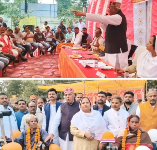 SIDHARTHNAGAR NEWS: दिव्यांग सशक्तीकरण विभाग द्वारा डुमरियागंज ब्लॉक परिसर में शनिवार को पूर्व में चिन्हित दिव्यांगजनों के लिए सहायक उपकरण वितरण शिविर आयोजित किया गया। शिविर के मुख्य अतिथि डुमरियागंज सांसद जगदम्बिका पाल और विशिष्ट अतिथि विधायक सैय्यदा खातून ने कुल 68 दिव्यांग लाभार्थियों में सहायक उपकरण वितरित किए, जिनमें 34 ट्राईसाइकिल, 60 बैसाखी, 11 व्हीलचेयर और 9 श्रवण यंत्र (कान मशीन) शामिल थे। उपकरण पाकर दिव्यांगजनों के चेहरों पर संतोष झलक रहा था। कार्यक्रम को संबोधित करते हुए सांसद जगदम्बिका पाल ने कहा कि डबल इंजन की सरकार दिव्यांगजनों को आत्मनिर्भर बनाने के लिए लगातार कार्य कर रही है। सरकार द्वारा दिव्यांग पेंशन, दुकान निर्माण, विवाह अनुदान से लेकर शिक्षा और रोजगार तक की कई योजनाएं संचालित की जा रही हैं ताकि कोई भी दिव्यांगजन खुद को असहाय महसूस न करे। शिविर में वरिष्ठ भाजपा नेता अमरनाथ सिंह सोनू, राम कुमार उर्फ चिंकू यादव, नासिर, राजू पाल, कमलेश चौरसिया, कसीम रिजवी, श्यामसुंदर अग्रहरि, राजेश द्विवेदी, बहरैची और पप्पू मलिक सहित कई लोग मौजूद रहे।
