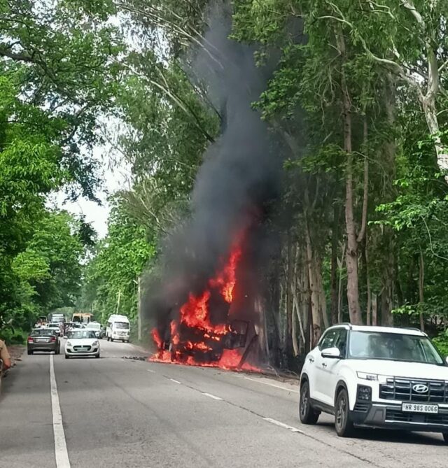 DEHRADUN: दिल्ली-देहरादून नेशनल हाईवे पर शाकुंभरी देवी गेट के पास मोहण्ड के जंगल में सड़क किनारे से होकर गुजर रहे बिजली के तारों से टकराकर दस टायरा ट्रक में आग लग गई। देखते ही देखते आग की लपटे आसमान छूने लगी, इस दौरान दहशत के मारे सड़क के दोनों तरफ ट्रैफिक जहां का तहां रुक गया और सूचना मोहण्ड पुलिस चौकी को भेजी गई। जब तक पुलिस मौके पर पहुंची तब तक सामान से लदा ट्रक जलकर राख में तब्दील हो चुका था।