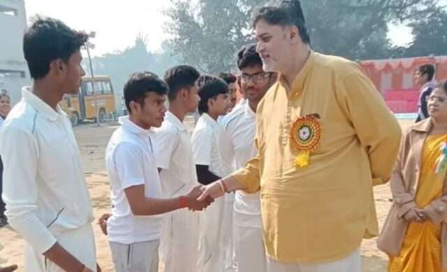 फोटो:त्रिशूल कप क्रिकेट चैंपियनशिप में खिलाड़ियों से मिलते डीपीपीएस के चेयरमैन अंशुल हीरामणि पांडेय