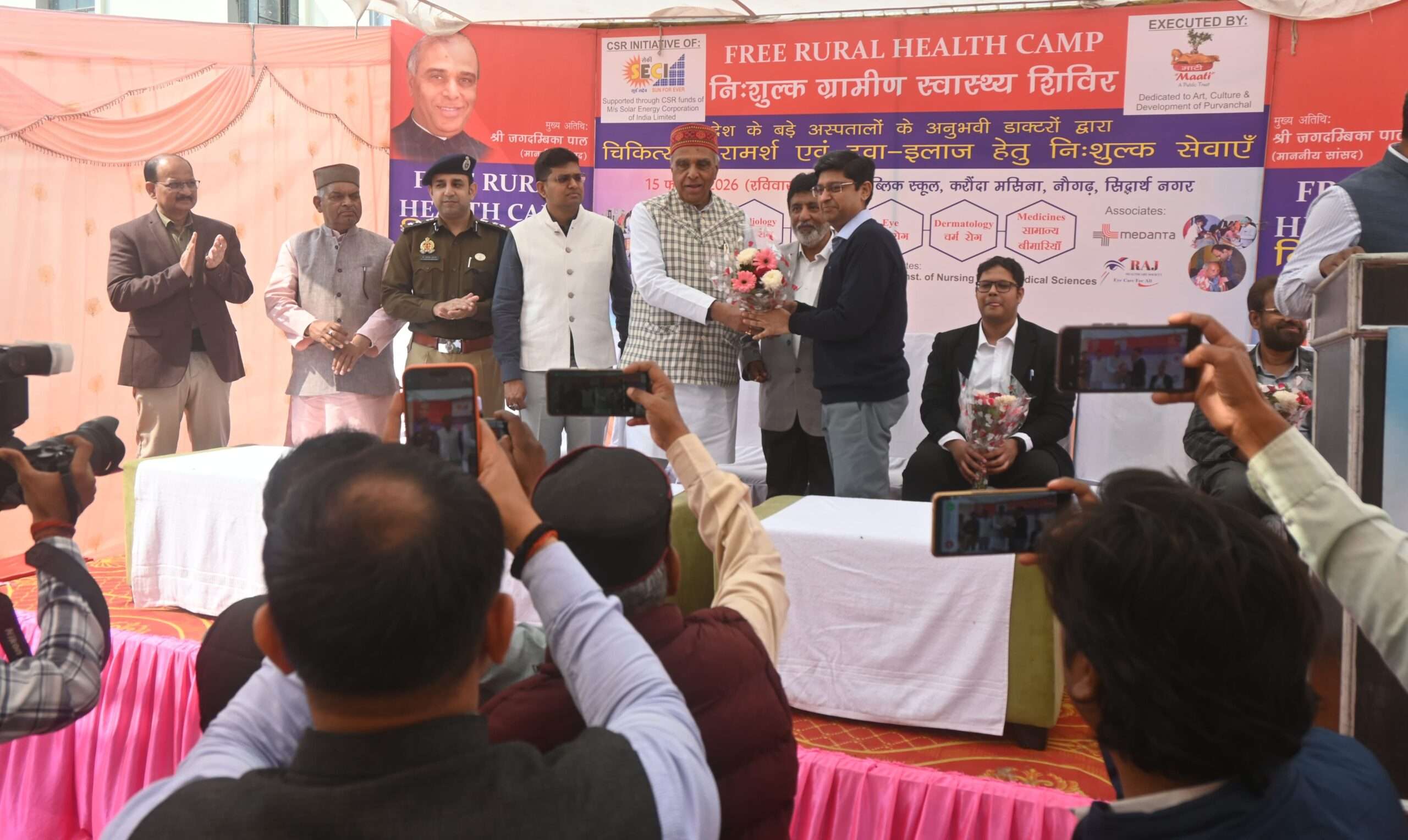 SIDHARTHNAGAR NEWS: सांसद डुमरियागंज जगदंबिका पाल, जिलाधिकारी शिवशरणप्पा जी एन तथा पुलिस अधीक्षक डॉ अभिषेक महाजन की उपस्थिति में करौंदा मसिना स्थित सिद्धार्थ पब्लिक स्कूल में निःशुल्क ग्रामीण स्वास्थ्य शिविर आयोजित किया गया। शिविर में विभिन्न बड़े अस्पतालों के अनुभवी चिकित्सकों ने मरीजों का परीक्षण कर परामर्श दिया तथा निःशुल्क दवा वितरण किया गया। हृदय, हड्डी, चर्म, नेत्र एवं सामान्य रोग विशेषज्ञों की टीम ने सैकड़ों मरीजों की जांच की। सांसद जगदंबिका पाल ने कहा कि स्वास्थ्य सर्वोपरि है। क्षेत्रवासियों को बेहतर चिकित्सा सुविधा उपलब्ध कराने के उद्देश्य से मेडिकल कॉलेज की स्थापना कराई गई है और समय-समय पर एम्स, मेदांता व पीजीआई के विशेषज्ञ चिकित्सकों को बुलाकर शिविर आयोजित किए जाते हैं, ताकि लोगों को उच्चस्तरीय उपचार स्थानीय स्तर पर मिल सके। उन्होंने विद्यालय प्रबंधन से कहा कि परीक्षण में जिन मशीनों की आवश्यकता हो, उन्हें उपलब्ध कराने में सहयोग किया जाएगा। जिलाधिकारी शिवशरणप्पा जी एन ने कहा कि आकांक्षी जनपद सिद्धार्थनगर में ऐसे शिविरों से आमजन को सीधा लाभ मिलता है और आगे भी इस प्रकार के आयोजन जारी रहेंगे। इस अवसर पर डॉ जनार्दन, डॉ अहमद (पूर्व डायरेक्टर, शिफा हॉस्पिटल), लाल जी त्रिपाठी उर्फ लाल बाबा, रमेश त्रिपाठी, पंकज चौबे सहित बड़ी संख्या में लोग उपस्थित रहे।