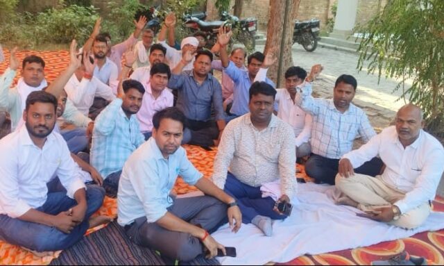 अधीक्षक अभियंता कार्यालय पर प्रदर्शन करते विद्युतकर्मी