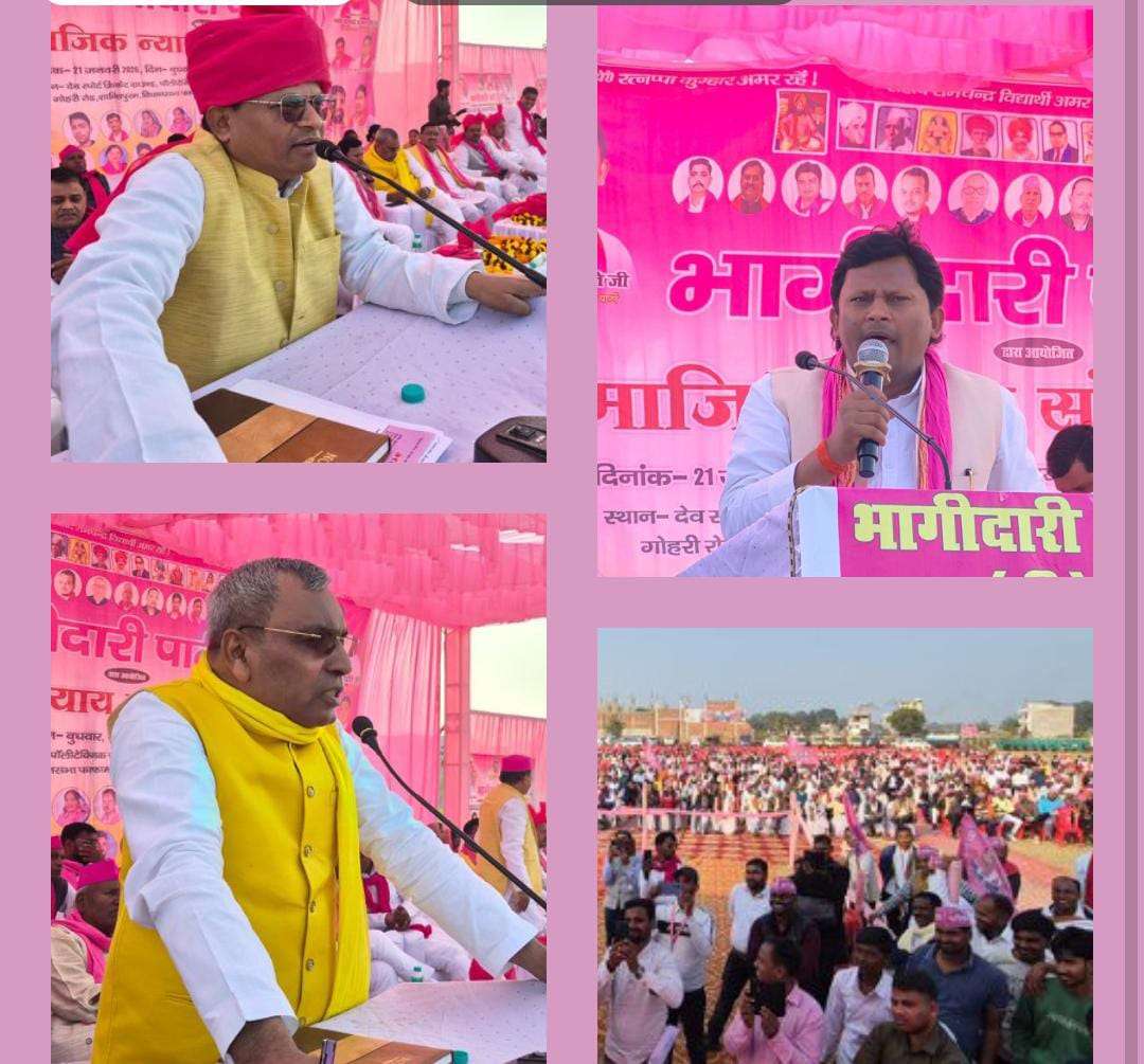 PRAYAGRAJ NEWS: गंगापार फाफामऊ विधानसभा के देव स्पोर्ट्स क्रिकेट ग्राउंड का मैदान गोहरी रोड शांतिपुरम में बुधवार को भागीदारी पार्टी के नेतृत्व में राष्ट्रीय अध्यक्ष प्रेमचंद प्रजापति की अध्यक्षता में सामाजिक न्याय संघर्ष महारैली को बतौर मुख्य अतिथि सुभासपा के राष्ट्रीय अध्यक्ष उत्तर प्रदेश सरकार के कैबिनेट मंत्री ओमप्रकाश राजभर विशाल जनसमूह को संबोधित करते हुए कहा कि भागीदारी पार्टी दलित,आदिवासी पिछड़ा वर्ग, अल्पसंख्यक और वंचित समुदायों के अधिकारों के रक्षा के लिए लड़ाई लड़ रही है। जो निरंतर समाज में समानता अधिकार और न्याय की मांग को संगठित रूप से उठाने का कार्य कर रही है। भागीदारी पार्टी निरंतर एक के बाद एक ऐतिहासिक रैली करके पूर्वांचल में सभी दलों के लिए एक सुनहरा विकल्प बनती जा रही है। अब तो ऐसा लगने लगा है जिसके साथ भागीदारी पार्टी उसकी सरकार। प्रेमचंद प्रजापति निरंतर वंचितों शोषितों की आवाज को बुलंद करने का कार्य कर रहे हैं। पूर्वांचल में लगभग 18 प्रतिशत अकेले प्रजापति समुदाय की आबादी है किंतु कोई भी दल इसे मानने को तैयार नहीं है। आज प्रेमचंद प्रजापति की इस लड़ाई में समाज को इतना धार दे दिया है कि यह वर्ग अपना डंडा झंडा लेकर अपने नेता के साथ चलने को तैयार हो गया है। कैबिनेट मंत्री राजभर ने कहा कि हम निरंतर सरकार से वार्तालाप कर रहे हैं कि सामाजिक न्याय समिति की रिपोर्ट 2026 क्षेत्र पंचायत चुनाव के पहले लागू करवा कर चुनाव कराया जाए जिससे वंचित वर्ग का भी राजनीति में प्रतिनिधित्व हो सके। 27 प्रतिशत ओबीसी के आरक्षण का पूरा लाभ कुछ गिनी चुनी जातियां ही ले जा रही हैं खास तौर से विपक्ष में बैठे अखिलेश यादव का वर्ग राजभर ने अखिलेश यादव पर तंज कसते हुए कहा कि अखिलेश यादव का पी.डी.ए एक झूठा और खोखला नारा है क्योंकि इन्होंने 2022 के विधानसभा चुनाव में प्रेमचंद प्रजापति सहित कई दलों को धोखा देने का काम किया यह नहीं चाहते हैं कि कोई भी छोटा राजनीतिक दल खड़ा हो सके आज जिस तरीके से इन्होंने प्रजापति समाज को धोखा दिया अब यह वर्ग पूर्ण रूपेण भागीदारी पार्टी के साथ खड़ा हो चुका है। भागीदारी पार्टी के राष्ट्रीय अध्यक्ष प्रेमचंद प्रजापति ने कहा कि भागीदारी पार्टी पूर्वांचल और बुंदेलखंड में 100 सीटों पर तैयारी कर रही है और हर सीट पर बड़ी से बड़ी रैली करके समाज को जगाने और बूथ पर काम करने का काम किया जा रहा है। अभी सामने क्षेत्र पंचायत चुनाव है जिसमें भागीदारी पार्टी उत्तर प्रदेश में हज़ार प्रधान बीडीसी और दो सौ के ऊपर जिला पंचायत चुनाव लड़ने जा रही है। भागीदारी पार्टी निरंतर अपने संगठन को मजबूत करने का काम कर रही है। आगामी 2027 विधानसभा चुनाव में जिसके साथ भागीदारी पार्टी होगी उसी की सरकार बन