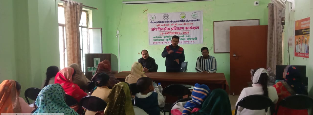 KAUSHAMBI NEWS : भारत सरकार की महत्वाकांक्षी योजना नेशनल मिशन ऑन नेचुरल फार्मिंग (NMNF) के अंतर्गत पांच दिवसीय कृषि सखी प्रशिक्षण कार्यक्रम का आज विधिवत शुभारम्भ किया गया। इस कार्यक्रम का उद्देश्य ग्रामीण महिलाओं को प्राकृतिक खेती की वैज्ञानिक तकनीकों से प्रशिक्षित कर उन्हें कृषि विस्तार की मजबूत कड़ी के रूप में विकसित करना है। कार्यक्रम के उद्घाटन सत्र में कृषि विज्ञान केन्द्र के वरिष्ट वैज्ञानिक ने प्रशिक्षण का शुभारम्भ किया। डॉ. अजय कुमार  ने अपने संबोधन में कहा कि प्राकृतिक खेती से किसानों की उत्पादन लागत में कमी, मृदा स्वास्थ्य में सुधार, पर्यावरण संरक्षण तथा स्वस्थ एवं सुरक्षित खाद्य उत्पादन सुनिश्चित किया जा सकता है। इसी क्रम में मृदा वैज्ञानिक डॉ. मनोज कुमार सिंह जी ने कृषि सखियों को प्राकृतिक खेती के मूल सिद्धांत, जीवामृत, बीजामृत, घनजीवामृत, नीमास्त्र, ब्रह्मास्त्र एवं ब्रह्मास्त्र, देशी गाय आधारित खेती, फसल चक्र, मृदा जीवांश संरक्षण तथा जैव-इनपुट्स के प्रयोग की सैद्धांतिक एवं व्यावहारिक जानकारी दी जाएगी। प्रशिक्षण में फील्ड डेमो और समूह चर्चा भी शामिल हैं। कृषि प्रसार वैज्ञानिक डॉ. अमित कुमार केशरी जी ने कृषि सखियों के खरीफ सत्र के फसलो की चुनोतियो एवं उसकी सफलता के बारे में चर्चा की और कहाँ कि प्रशिक्षण प्राप्त करने के पश्चात कृषि सखियाँ अपने-अपने गांवों में किसानों को प्राकृतिक खेती अपनाने हेतु प्रेरित करेंगी तथा सरकार की योजनाओं को जमीनी स्तर तक पहुँचाने में महत्वपूर्ण भूमिका निभाएंगी।