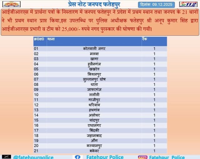 विशेष उपलब्धि यह भी रही कि जनपद के 21 थानों ने सामूहिक रूप से प्रदेश स्तरीय रैंकिंग में प्रथम स्थान हासिल किया, जिससे जिले की कार्यप्रणाली को प्रदेश स्तर पर सराहा गया। महज महिला थाना को इस उपलब्धि से हाथ मलना पड़ा। इस उल्लेखनीय सफलता पर खुशी व्यक्त करते हुए पुलिस अधीक्षक अनूप कुमार सिंह ने आईजीआरएस प्रभारी एवं संबंधित टीम को ₹25,000 का नगद पुरस्कार देने की घोषणा की। उन्होंने कहा कि यह उपलब्धि हमारी टीम की मेहनत, समयबद्ध कार्यशैली, जनता की शिकायतों के प्रति संवेदनशीलता और जवाबदेही की भावना को दर्शाती है। फतेहपुर पुलिस त्वरित न्याय और पारदर्शी कार्यप्रणाली के प्रति निरंतर समर्पित रहेगी। फतेहपुर पुलिस की यह उपलब्धि जिला पुलिस तंत्र की जनसेवा, संवेदनशीलता एवं सुव्यवस्थित शिकायत निस्तारण प्रक्रिया का मजबूत प्रमाण बनकर सामने आई है, जो आने वाले समय में टीम को और बेहतर कार्य के लिए प्रेरित करेगी।