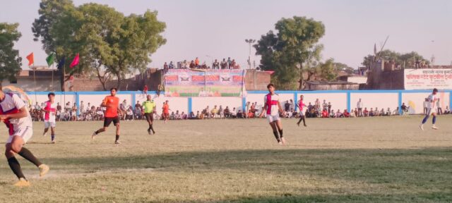 LAKHIMPUR KHERI NEWS: कस्बे में चल रहे महारानी सुरथ कुमारी स्टेट फुटबाल टूर्नामेंट के तीसरे दिन सिंगाही के फुटबाल ग्राउंड पर तीन मैच खेले गये । खेले गए मैच मे हसन सपोर्टिंग क्लब, गोरखपुर और गौरीफंटा की टीमें विजयी रही।बुधवार को सिंगाही में चल रहे महारानी सुरथ कुमारी स्टेट फुटबाल टूर्नामेंट में पहला मैच हसन सपोर्टिंग क्लब नानपारा और गोला के मध्य खेला गया। हसन सपोर्टिंग क्लब नानपारा की टीम ने अच्छा प्रदर्शन करते हुए टीम के खिलाड़ी सौगात ने पहले हाफ के 25वें मिनट पर एक गोल मार कर बढ़त बनाई इसी टीम के खिलाड़ी सैफअली ने खेल के दूसरे हाफ में 37वे मिनट और 50वें मिनट पर दो गोल मार कर अपनी टीम को 3-0 जीत लिया। इस मैच में नानपारा टीम के खिलाड़ी संदीप कुमार गोला के खिलाड़ी लवकुश को पीला कार्ड दिखा कर चेतावनी दी। दूसरा मैच के सपोर्टिंग क्लब सैफई वर्सेज गोरखपुर के बीच खेला गया। पहले हाफ में दोनों टीमें कोई गोल नही कर सकीं। खेल के दूसरे हाफ में सपोर्टिंग क्लब सैफई के खिलाड़ी अर्सलान ने पहला गोल 38वें मिनट पर जड़ दिया। जवाब में गोरखपुर की टीम के खिलाड़ी सैफअली ने 59वें मिनट पर मार कर खेल को बराबरी पर ले आई। अंत तक कोई टीम कोई भी गोल नहीं कर पाई। पेनाल्टी शूट में गोरखपुर की टीम ने मैच को 3-1मैच को जीत लिया। तीसरा मैच गौरीफंटा और झांसी के मध्य खेला गया। खेल के शुरुआती दौर में गौरीफंटा के खिलाड़ी शुभम ने दूसरे मिनट पर पहला गोल करने में कामयाब हुए।दूसरे हाफ में इसी टीम के खिलाड़ी मो0 शाहिद ने 36वें मिनट पर दूसरा गोल जड़ कर मैच को जीत लिया। टूर्नामेंट के निर्णायक अय्यूब अली, देवजीत सिंह, धीरज पटेल, संजय पटेल, सौरभ रहे। टूर्नामेंट के महामंत्री शिखर तिवारी ने बताया की गुरुवार को 12 बजे क्वार्टर फाइनल मैच में अमन सपोर्टिंग क्लब सिंगाही,गौतम सपोर्टिंग क्लब सिंगाही,गोरखपुर, गौरीफंटा की टीमें भाग लेंगी। आज के मुख्य महमान टूर्नामेंट के कार्यवाहक अध्यक्ष विक्रमेन्द्र कुमार भल्ला, जिला पंचायत सदस्य दिनेश सिंह, प्रधान अखिलेश यादव पिंटू, सुखदेव सिंह, शिशिर गुप्ता, रवि शुक्ला, मोहयद्दीन अंसारी, उत्तम सोनी, उमाशंकर तिवारी, अमर गुप्ता, जितेन्द्र सिंह, वासू गुप्ता, जावेद सहित आज हजारों की संख्या में पहुचें खेल प्रेमियों नें आयोजित हो रहे महारानी सुरथ कुमारी स्टेट फुटबाल टूर्नामेंट के मैच का आनन्द लिया।