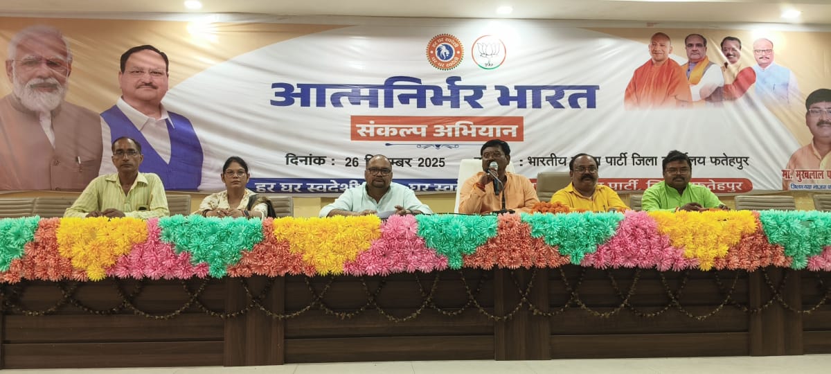 FATEHPUR NEWS: शुक्रवार को जेल रोड स्थित भारतीय जनता पार्टी कार्यालय में आत्मनिर्भर भारत संकल्प अभियान की कार्यशाला आयोजित हुई, जिसमें वक्ता के रूप में जिलाध्यक्ष मुखलाल पाल द्वारा सम्बोधित किया गया। कार्यक्रम को संबोधित करते हुए जिलाध्यक्ष मुखलाल पाल ने कहा कि राष्ट्रीय अध्यक्ष जगत प्रकाश नड्डा द्वारा यह निर्णय लिया गया है कि आत्मनिर्भरता का यह संदेश आत्मनिर्भर भारत संकल्प अभियान के माध्यम से देश के हर नागरिक तक पहुंचाया जाये और उन्हें स्वदेशी उत्पादों के उपयोग तथा स्वदेशी जीवन मूल्यों को अपनाने का संकल्प लेने के लिए प्रेरित किया जाये। उपस्थित मंडल अध्यक्षों व मंडल संयोजकों को बताते हुए जिलाध्यक्ष ने कहा कि 28, 29 व 30 सितंम्बर को मंडल स्तर पर कार्यशाला आयोजित होनी है, मंडल कार्यशाला सम्पन्न होने पर विधिवत अभियान को जन-जन तक पहुंचाना है, जिसमें स्वदेशी बनाम विदेशी विषय पर डिबेट व विद्यालयों में एक हफ्ते तक स्वदेशी उत्पाद का उपयोग व उनके अनुभवों को सोशल मीडिया पर साझा करना है, वहीं आत्मनिर्भर भारत का सन्देश देने वाले पर्चे, बैनर व स्टीकर का उपयोग करना है। कार्यक्रम में रवींद्र पाल सिंह, उदय लोधी, पुष्पराज पटेल, कुलदीप भदौरिया, रेखा सरोज, अपर्णा सिंह गौतम, अर्चना त्रिपाठी, बैजनाथ वर्मा, सुशीला मौर्या, प्रवीण सिंह, विक्रम सिंह चंदेल, अमित शिवहरे, सुमित द्विवेदी, विकास पासवान, अमित तिवारी, राधा साहू, ज्ञानचंद केसरवानी, डॉ शिवप्रसाद त्रिपाठी, जितेंद्र सिंह गौतम, अजय सिंह रिंकू लोहारी, मुन्ना सिंह सांतो, धनंजय द्विवेदी, स्वरूप राज सिंह जूली, अतुल त्रिवेदी, मोहर दयाल सिंह, जसवंत गिहार, राम महेश निषाद, रामनरायण शुक्ला, धर्मेन्द्र सिंह सहित पार्टी पदाधिकारी व कार्यकर्ता उपस्थित रहे हैं।