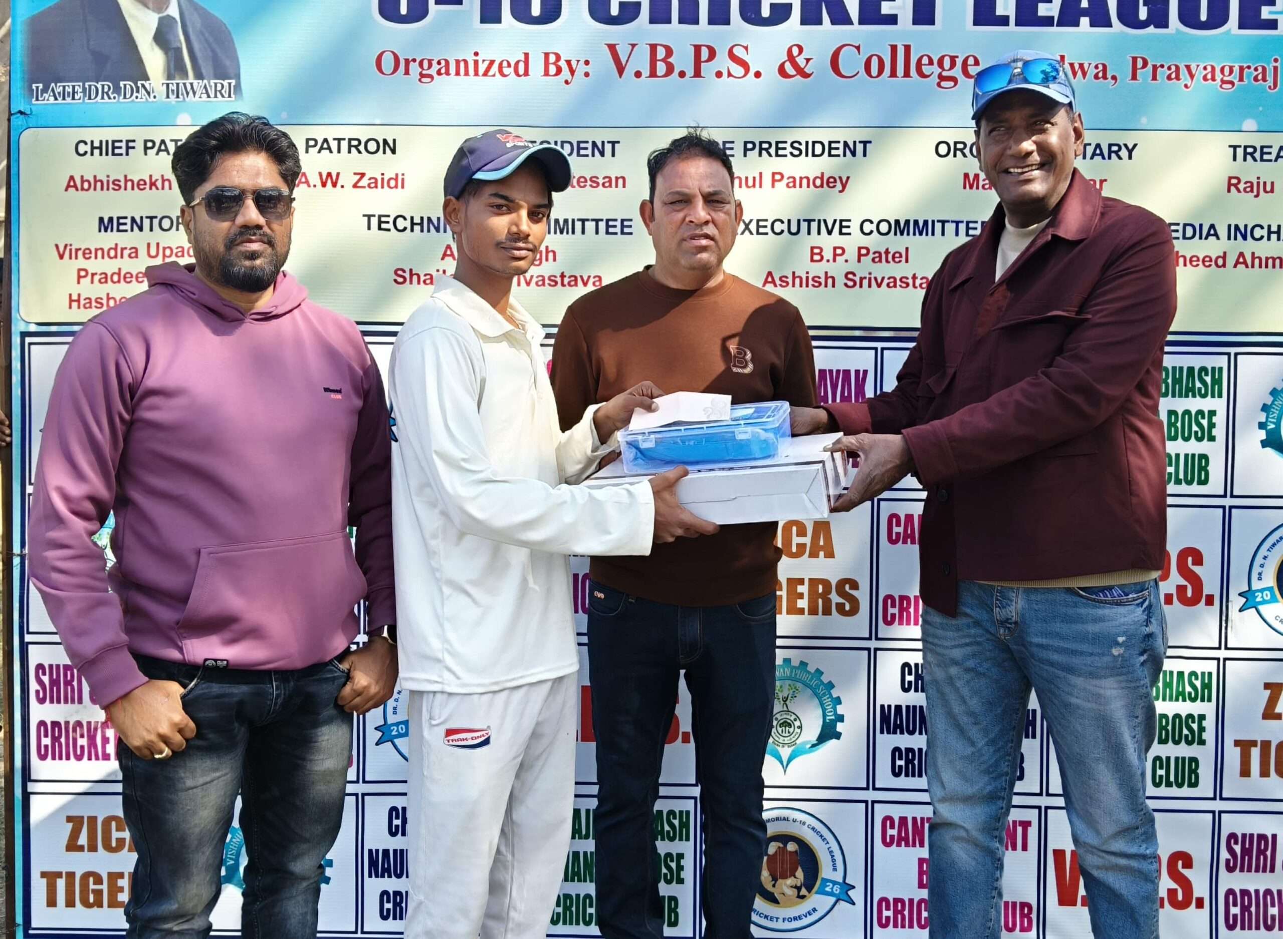 PRAYAGRAJ NEWS:  विष्णु भगवान पब्लिक स्कूल ने श्री सहायक क्लब को 8 विकेट से हराकर डॉ. डीएन तिवारी स्मृति अंडर-16 क्रिकेट प्रतियोगिता में पूरे अंक प्राप्त किये। इस जीत में ओम तिवारी (60 रन नाबाद, 25 गेंद, छह चौके, पांच छक्के) और दीपांशु की अचूक गेंदबाजी (6-0-34-3) की महत्वपूर्ण भूमिका रही।