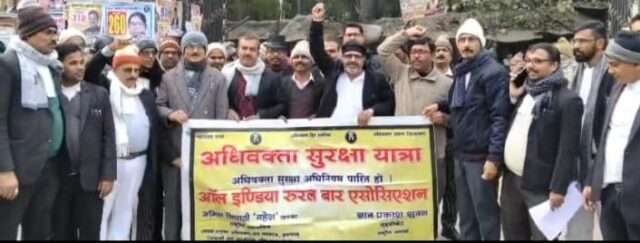 DEVARIYA NEWS: आल इण्डिया रूरल बार एसोसिएसन द्वारा उत्तर प्रदेश में लखनऊ से निकली अधिवक्ता सुरक्षा यात्रा बुधवार को प्रयागराज, भदोही होते हुए देवरिया पहुचंी। एसोसिएसन के राष्ट्रीय महासचिव अनिल कुमार तिवारी महेश व राष्ट्रीय संगठन मंत्री अनूप कुमार पाण्डेय के संयुक्त नेतृत्व में पहुंची अधिवक्ता सुरक्षा यात्रा में शामिल अधिवक्ताओं ने यहां दीवानी अदालत गेट के समीप अधिवक्ता सुरक्षा अधिनियम विधेयक पारित कराए जाने की मांग को लेकर जमकर नारेबाजी भी की। यहां अधिवक्ताओं की सभा को संबोधित करते हुए एसोसिएसन के राष्ट्रीय महासचिव अनिल कुमार तिवारी महेश ने कहा कि संसद के बजट सत्र में यदि अधिवक्ता सुरक्षा अधिनियम विधेयक केंद्र सरकार ने पारित नही कराया तब वकील दिल्ली मार्च करते हुए संसद भवन के सामने तगड़ा विरोध प्रदर्शन करेंगे। उन्होने कहा कि अधिवक्ता सुरक्षा अधिनियम विधेयक में सुरक्षा के साथ अधिवक्ताओं के लिए कैशलेस हेल्थ बीमा व बुजुर्ग अधिवक्ता पेंशन के प्राविधान भी शामिल किये गये हैं। इसके बाद राष्ट्रीय महासचिव अनिल कुमार तिवारी महेश ने दीवानी परिसर में अधिवक्ताओं को अधिनियम के मसौदे की प्रतियां सौपते हुए संघर्ष की मजबूती का आहवान किया। उन्होने अधिवक्ता सुरक्षा अधिनियम विधेयक के समर्थन में सहयोग देने वाले अधिवक्ताओं को एसोसिएसन की ओर से सम्मान पत्र भी प्रदान किया। आमसभा की अध्यक्षता बार एसोसिएसन देवरिया के अध्यक्ष मनोज मिश्रा व संचालन मंत्री अर्जुन यादव ने किया। इस मौके पर विनीत यादव, हरेकृष्ण तिवारी, पूनम सिंह, बीनू वर्मा, हरकेश पाण्डेय, विश्वेन्द्र कुमार सिंह, निरंजन सिंह बघेल, अजय यादव, वैभवकांत मिश्र, राधेश्याम तिवारी, पारसनाथ चौहान, गीता पाण्डेय, रामसकल पाण्डेय आदि अधिवक्ता रहे। अधिवक्ता सुरक्षा यात्रा का देवरिया में संयोजन करते हुए वरिष्ठ अधिवक्ता राजा मान सिंह की अगुवाई में वकीलों ने यहां जोरदार स्वागत भी किया।