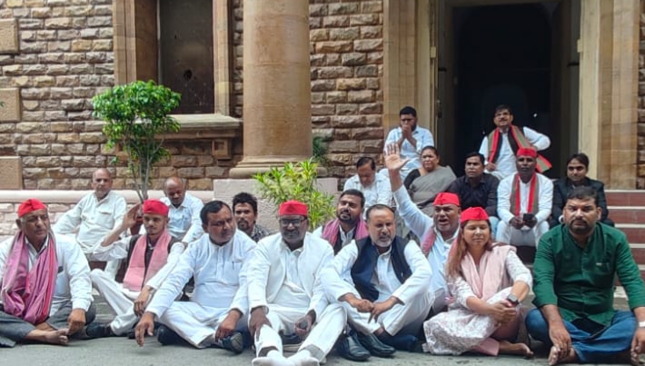सपा नेता की गिरफ़्तारी से नाराज सपाई पुलिस मुख्यालय पर धरने पर बैठे