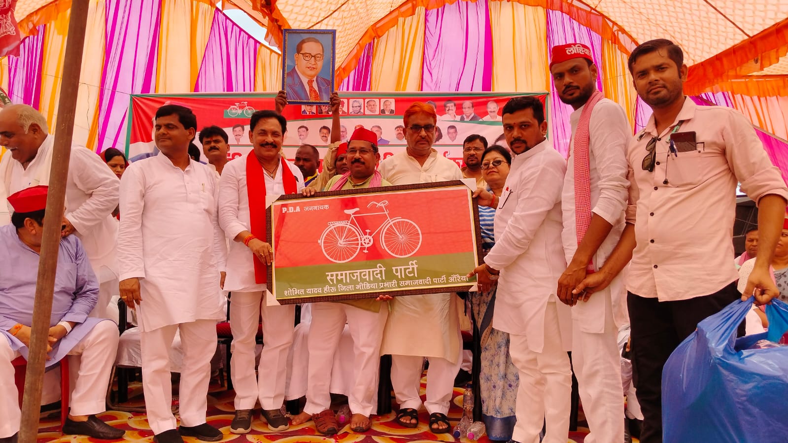 AURAIYA NEWS: समाजवादी पार्टी कार्यालय ककोर में संविधान मान स्थापना दिवस (आरक्षण दिवस) बड़े ही हर्षोल्लास के साथ मनाया गया। मुख्य अतिथि पूर्व केबिनेट मंत्री दद्दू प्रसाद उपस्थित रहे।  कार्यक्रम की अध्यक्षता समाजवादी के जिला अध्यक्ष सर्वेश बाबू गौतम एवं संचालन जिला महासचिव ओमप्रकाश ओझा ने किया। पूर्व मंत्री दद्दू प्रसाद जी ने कहा कि भाजपा सरकार संविधान को खत्म करने का कार्य कर रही है अगर देश और प्रदेश में कोई पार्टी संविधान बचा सकती है तो वह केवल समाजवादी पार्टी है उन्होंने कहा कि 2027 में समाजवादी पार्टी पूर्ण बहुमत से सरकार बनाने का कार्य करेगी कहा कि समाजवादी पार्टी जितना कार्यकर्ता किसी पार्टी के पास जुझारू नहीं है इसलिए हर बूथ पर समाजवादी पार्टी 2027 में सरकार बनाने का कार्य करेगी। इस मौके पर प्रमुख रूप से दिबियापुर विधायक प्रदीप यादव, बिधूना विधायिका रेखा वर्मा, पूर्व मंत्री विनोद यादव कक्का, पूर्व विधायक मदन गौतम, पूर्व विधायक प्रमोद गुप्ता एल एस, पूर्व विधायक राम जी शुक्ला, पल्लवी पाल,गनेश सिंह, जिला पंचायत सदस्य सोनू त्यागी,  ध्रुव यादव, प्रशान्त दिवाकर, गौरव यादव, वीरेंद्र राजपूत, रश्मि यादव, बड़े सिंह गौर, विनय यादव पतरे,रानू पालीवाल, राजकुमार दोहरे, ओम जी यादव, हिमांशु पाल, मनोज कोरी, अजय यादव, मधु कठेरिया, पुष्पेन्द्र यादव, अशोक गुप्ता, दीपू यादव, नरेंद्र पाल, मोहम्मद बब्लू रामशंकर निषाद, श्याम बाबू यादव, साज़िद हशमत, जुबैर पठान एवं मीडिया प्रभारी शोभित यादव हीरू सहित अन्य पदाधिकारी मौजूद रहे। इस मौके पर पंडाल में भारी संख्या में भीड़ मौजूद रही।