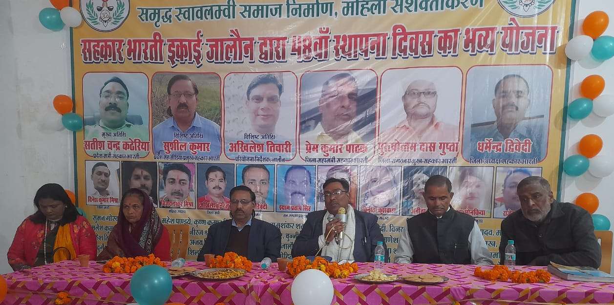 JALAUN NEWS: सहकार भारती के 48 वें स्थापना दिवस पर पाठक टावर कालपी रोड उरई में आयोजित भव्य समारोह उ.प्र. के सहकार भारती के उत्तर प्रदेश महामंत्री सतीश चन्द्र कठेरिया के मुख्य आतिथ्य में संपन्न हुआ। समारोह समापन पर सहकार भारती के जिलाध्यक्ष धर्मेन्द्र द्विवेदी द्वारा सभी अतिथियों का माल्यार्पण कर स्वागत कर सभी उपस्थित लोगों का आभार भी व्यक्त किया।जिसका संचालन गरिमा पाठक ने किया। मुख्य अतिथि कठेरिया ने संगठन को और मजबूत करने के साथ-साथ इसकी और भी शाखाओं का गठन कर उन्हें रोजगार से जोड़ने का भी कार्य करें। ताकि संगठन को और अधिक मजबूत किया जा सके। उसके जबाब में सहकार भारती के जिला उपाध्यक्ष महेश पाण्डेय ने मुख्य अतिथि को आश्वासन देते हुए कहा कि जनपद में आपके कथनानुसार और भी दूसरी ईकाईयों का शीघ्र गठन किया जायेगा। इस अवसर पर प्रेमकुमार पाठक जिला महामंत्री, रामनिवास शुक्ला, वैरागी जी, पुरुषोत्तम गुप्ता उर्फ घंटी कोषाध्यक्ष, ओपी तिवारी, गोपाल बाबू विश्नोई, राकेश कुमार तिवारी,राम आसरे त्रिवेदी, विनोद कुमार मिश्रा आदि सैकड़ों लोगों ने भाग लिया।