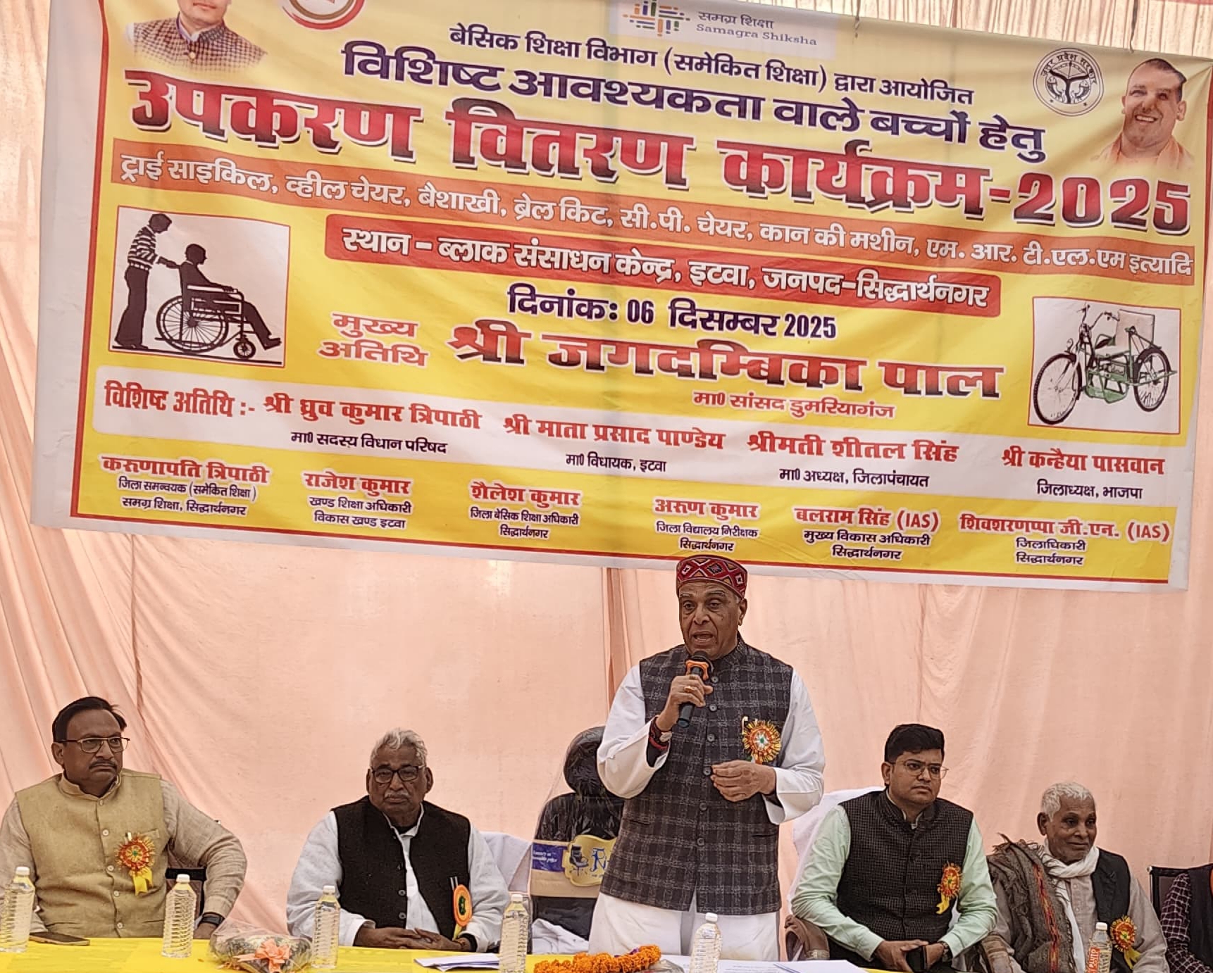 SIDHARTHNAGAR NEWS: इटवा ब्लाक संसाधन केंद्र (बीआरसी) परिसर में शनिवार को बेसिक शिक्षा विभाग समेकित शिक्षा के तत्वावधान में विशिष्ट आवश्यकता वाले बच्चों हेतु उपकरण वितरण कार्यक्रम आयोजित किया गया। कार्यक्रम के दौरान कुल 228 दिव्यांग बच्चों को उनकी दिव्यांगता के अनुरूप उपकरण वितरित किए गए। कार्यक्रम के मुख्य अतिथि डुमरियागंज के सांसद जगदंबिका पाल, विशिष्ट अतिथि नेता प्रतिपक्ष माता प्रसाद पाण्डेय और जिलाधिकारी शिवशरनप्पा जी. एन. के हाथों बच्चों को उपकरण प्रदान किए गए।