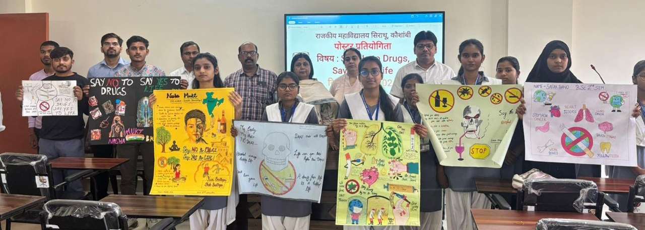 KAUSHAMBI NEWS: राजकीय महाविद्यालय सिराथू में शुक्रवार को नशा मुक्ति जागरूकता के तहत पोस्टर प्रतियोगिता आयोजित की गई। कार्यक्रम प्राचार्य प्रो. संजय प्रसाद शर्मा के मार्गदर्शन में हुआ। प्रतियोगिता का विषय ‘Say No to Drugs, Say Yes to Life’ रहा। छात्र-छात्राओं ने पोस्टरों के माध्यम से नशे के दुष्प्रभाव, सामाजिक व पारिवारिक असर तथा बचाव के उपायों को प्रभावी ढंग से प्रस्तुत किया। जन्तु विज्ञान विभागाध्यक्ष डॉ. धर्मेंद्र सिंह ने प्रतिभागियों की सराहना करते हुए युवाओं से नशे से दूर रहने की अपील की। प्रतियोगिता में बीएससी की छात्रा वर्तिका साहू प्रथम, प्रकाश मालवीय द्वितीय व निहारिका साहू तृतीय स्थान पर रहे। आयोजक डॉ. उत्तम कुमार शुक्ल ने इसे जागरूकता बढ़ाने की सराहनीय पहल बताया। निर्णायक मंडल में प्रो. मीरा पाल, डॉ. विकासचंद्र व डॉ. विपुल सिंह शामिल रहे। इसी क्रम में मिशन शक्ति फेज-5 के द्वितीय चरण के तहत आयोजित कार्यक्रम में प्रो. मीरा पाल ने महिला उद्यमियों की सफलता की कहानियां सुनाते हुए छात्राओं को आत्मनिर्भर बनने के लिए प्रेरित किया। कार्यक्रम का संचालन डॉ. उत्तम कुमार शुक्ल ने किया, जबकि आभार मिशन शक्ति प्रभारी डॉ. जसविंदर कौर ने व्यक्त किया। इस दौरान महाविद्यालय के प्राध्यापक व कर्मचारी मौजूद रहे।