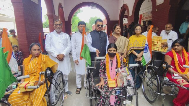 JAUNPUR NEWS: गांधी जयंती और पूर्व प्रधानमंत्री लाल बहादुर शास्त्री की जयंती के अवसर पर “सेवा पखवाड़ा” के अंतर्गत कलेक्ट्रेट परिसर में दिव्यांगजन सशक्तीकरण विभाग द्वारा ट्राईसाइकिल और सहायक उपकरण वितरण कार्यक्रम का आयोजन किया गया। कार्यक्रम के मुख्य अतिथि राज्य मंत्री (स्वतंत्र प्रभार), खेल एवं युवा कल्याण विभाग श्री गिरीश चंद्र यादव, मा० सांसद राज्यसभा श्रीमती सीमा द्विवेदी तथा जिलाध्यक्ष श्री पुष्पराज सिंह ने संयुक्त रूप से 36 दिव्यांगजनों को ट्राईसाइकिल वितरित की। इस दौरान जिलाधिकारी डॉ. दिनेश चंद्र, अपर जिलाधिकारी राम अक्षयवर चौहान, मुख्य राजस्व अधिकारी अजय अंबष्ट तथा जिला दिव्यांगजन सशक्तीकरण अधिकारी श्रीमती दिव्या शुक्ला सहित अन्य अधिकारी उपस्थित रहे।vकार्यक्रम में उपस्थित अतिथियों ने हरी झंडी दिखाकर ट्राईसाइकिल की रैली को रवाना किया। इसके पश्चात महात्मा गांधी एवं लाल बहादुर शास्त्री जी के चित्रों पर माल्यार्पण कर उन्हें श्रद्धांजलि अर्पित की गई।