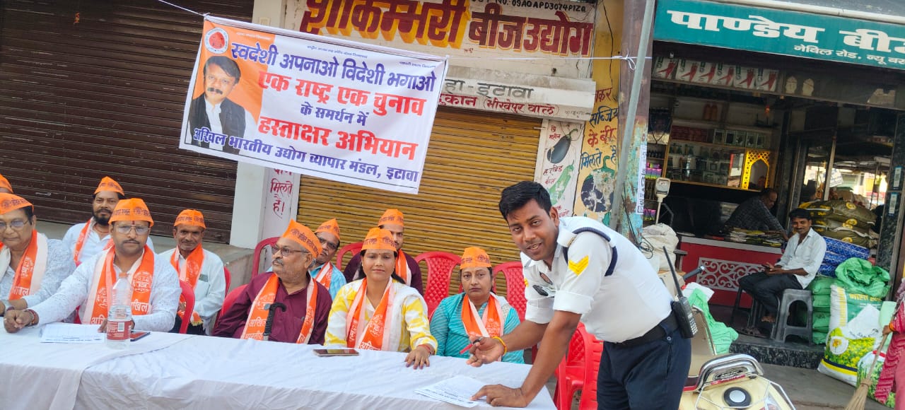 ETAWA NEWS: अखिल भारतीय उद्योग व्यापार मंडल इटावा के जिला अध्यक्ष जागेश्वर प्रसाद अग्रवाल, जिला प्रभारी मनोज अग्रवाल, जिला महामंत्री धर्मेंद्र जैन के नेतृत्व में रोडवेज बस स्टैंड तिराहे पर युवा जिला वरिष्ठ उपाध्यक्ष विकास शाक्य के प्रतिष्ठान पर स्वदेशी और एक राष्ट्र एक चुनाव के समर्थन में हस्ताक्षर अभियान चलाया गया जिसमें सैकड़ों लोगों ने इस पक्ष में अपने हस्ताक्षर किये।जिला महामंत्री धर्मेंद्र जैन कहा. मौजूदा परिस्थितियों में देशवासियों को ताकतवर बनाने के लिए अमेरिका और चीन के उत्पादों को टक्कर देने के लिए स्वदेशी वस्तुओं का इस्तेमाल करना पड़ेगा हस्ताक्षर अभियान में व्यापारियों एवं समाज के विभिन्न वर्गों ने अपनी सहमति व्यक्त करते हुए हस्ताक्षर किए. जिला वरिष्ठ उपाध्यक्ष डॉ० हरिशंकर पटेल ने स्वदेशी अपनाओ विदेशी भगाओ का लोगों को संकल्प दिलाया।जिला प्रभारी मनोज अग्रवाल ने कहा यह अभियान राष्ट्रीय अध्यक्ष पूर्व राज्य मंत्री संदीप बंसल के आह्वान पर पूरे प्रदेश में चलाया जा रहा है व्यापार मंडल जनपद के प्रत्येक कस्बा एवं बाजारों में यह अभियान निरंतर चला कर लोगों को जागरूक करेंगे।अभियान में प्रमुख रूप से महिला जिला अध्यक्ष अर्चना कुशवाहा,जिला कोषाध्यक्ष सर्वेश चौहान, जिला प्रवक्ता इकरार अहमद, युवा जिला महामंत्री रंजीत सिंह कुशवाहा, युवा जिला वरिष्ठ उपाध्यक्ष विकास शाक्य, लल्लू वारसी, यामीन रिंकू चौधरी, अर्चना अग्रवाल, अशोक कुमार कुशवाहा नई मंडी अध्यक्ष, सत्येंद्र कुशवाहा, जिला वरिष्ठ उपाध्यक्ष हरिओम गुप्ता, संतोष कुमार वर्मा, उमेश कुशवाहा,अभिषेक जैन आदि लोग उपस्थित रहे।