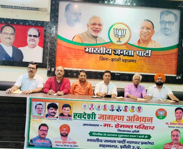 JHANSI NEWS: भारतीय जनता पार्टी के कार्यालय पर भाजपा व्यापार प्रकोष्ठ झांसी महानगर द्वारा “स्वदेशी जागरण अभियान “ की जिला कार्यकारिणी की बैठक भाजपा महानगर ज़िलाध्यक्ष हेमन्त परिहार की अध्यक्षता मे एवं भाजपा व्यापार प्रकोष्ठ क्षेत्रीय सहसंयोजक कानपुर बुंदेलखंड क्षेत्र मनमोहन गेड़ा के मुख्य आतिथ्य एवं वरिष्ठ व्यापारी नेता संजय पटवारी की उपस्थिति में संपन्न हूई. कार्यक्रम का संचालन महानगर जिला संयोजक जीतू सोनी ने किया एवं कार्यक्रम का संयोजन महानगर जिला सहसंयोजक प्रदीप त्रिपाठी एवं सरदार कृष्णपाल सिंह ने किया. इस अवसर पर विभिन्न बाजारों के संयोजक ,मंडलों के संयोजक, व्यापार मंडलों के पदाधिकारी गण एवं भारी संख्या में व्यापारी गण उपस्थित रहे। झांसी के वरिष्ठ व्यापारी नेता संजय पटवारी ने कहा कि एक मजबूत एवं सशक्त राष्ट्र निर्माण के लिए हम सभी को स्वदेशी उत्पादकों को आगे लाना होगा. मुख्य अतिथि मनमोहन गेड़ा ने बताया कि अमेरिका द्वारा लगाए गए टेरिफ से हम लोग बिल्कुल भी चिंतित नहीं होंगे उसका जवाब हम सभी एकजुट होकर मजबूती के साथ देंगे. महानगर अध्यक्ष हेमंत परिहार ने उपस्थित सभी व्यापारी भामाशाहों से अपील की हम सभी मिलकर सिर्फ और सिर्फ स्वदेशी निर्मित चीजों का ही उपयोग करें एवं ज्यादा से ज्यादा अन्य लोगों को भी स्वदेशी जागरण अभियान से जोड़कर उन्हें भी स्वदेशी चीजों का उपयोग करने के लिए प्रेरित करें. झांसी महानगर के जिला संयोजक जीतू सोनी ने कहा की  हमारे लिए राष्ट्र ही  सर्वोपरि है और  हम सभी संकल्प लेते हैं कि हम विभिन्न कार्यक्रमों के माध्यम से आम जनमानस तक इस बात को पहुंचाएंगे की स्वदेशी निर्मित चीजों के उपयोग से हमारे देश को क्या – क्या फायदा हो सकता है एवं  कैसे हमारा भारत देश आर्थिक रूप से मजबूत होकर विश्व गुरु बन सकता है.