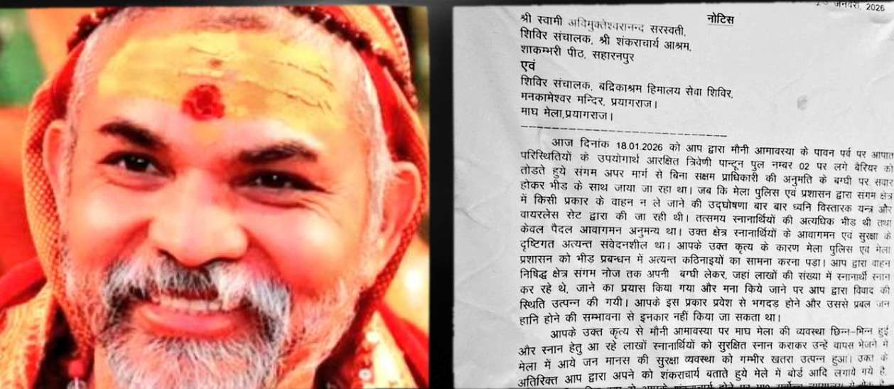 PRAYAGRAJ NEWS: प्रयागराज मेला प्राधिकरण ने शंकराचार्य स्वामी अविमुक्तेश्वरानंद को भेजे नोटिस में लिखा– “आपके कृत्य से मौनी अमावस्या पर व्यवस्था छिन्न–भिन्न हुई। लाखों श्रद्धालुओं की सुरक्षा को खतरा पैदा हुआ। 24 घंटे में बताएं कि इस कृत्य के कारण आपको दी गई जमीन और सुविधाएं निरस्त करके सदैव के लिए मेले में एंट्री से प्रतिबंधित क्यों न कर दिया जाए।