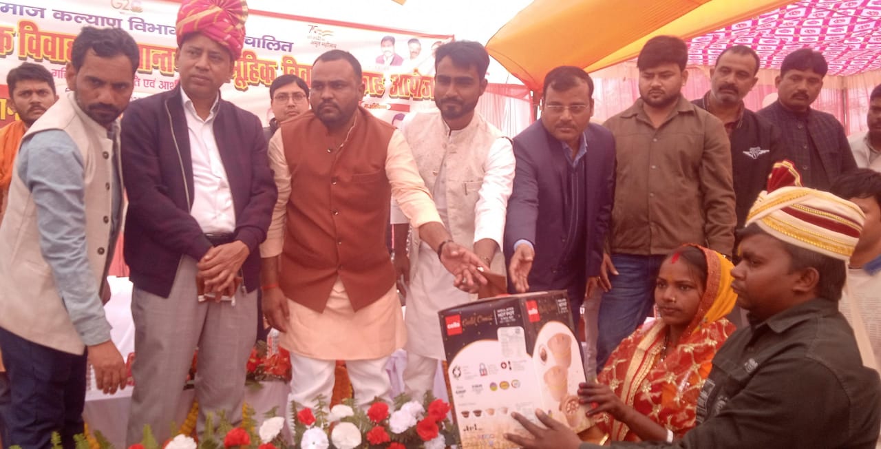 FATEHPUR NEWS: हसवा विकास खंड क्षेत्र अंतर्गत नेशनल हाईवे स्थित द रॉयल गार्डन परिसर में शनिवार को मुख्यमंत्री सामूहिक विवाह समारोह का आयोजन किया गया। कार्यक्रम की शुरुआत सुबह 10 बजे हुई, जिसमें कुल 57 जोड़ों का पंजीकरण किया गया। इनमें से 51 जोड़ों ने वैदिक मंत्रोच्चार के बीच सात फेरे लेकर दांपत्य जीवन में प्रवेश किया। आयोजन स्थल को पारंपरिक ढंग से सजाया गया था। ढोल-नगाड़ों और मंगलगीतों के बीच 21 आचार्यों ने विवाह की समस्त रस्में विधिवत संपन्न कराईं। सुबह से ही वर-वधुओं और उनके परिजनों में उत्साह और चहल-पहल बनी रही। मुख्य अतिथि ब्लॉक प्रमुख विकास पासवान एवं खंड विकास अधिकारी (बीडीओ) अशोक कुमार सिंह ने नवविवाहित जोड़ों को आशीर्वाद देते हुए कहा कि सामूहिक विवाह जैसे आयोजन सामाजिक समरसता को बढ़ावा देते हैं। इससे आर्थिक रूप से कमजोर परिवारों को सम्मान के साथ बेटियों का विवाह संपन्न कराने का अवसर मिलता है और दहेज जैसी कुरीतियों पर भी अंकुश लगता है। उन्होंने नवदंपतियों से परस्पर विश्वास, प्रेम और सहयोग के साथ जीवन पथ पर आगे बढ़ने का आह्वान किया। समारोह के दौरान थरियांव थाना प्रभारी राजेंद्र सिंह एवं हसवा चौकी इंचार्ज अरुण मौर्य ने सुरक्षा व्यवस्था का निरीक्षण किया। आयोजन समिति की ओर से नवदंपतियों को गृहस्थी का सामान भेंट किया गया। विवाह उपरांत सामूहिक भोज का भी आयोजन किया गया। इस अवसर पर एडीओ पंचायत कौशलेन्द्र सिंह, जिला समाज कल्याण अधिकारी अवनीश यादव, नोडल प्रभारी/उप कृषि निदेशक सत्येंद्र सिंह, तहसीलदार लक्ष्मी बाजपेई, एपीओ नितिन श्रीवास्तव, समाज कल्याण अधिकारी ललित कुमार, आईएसबी धर्मपाल सोनी सहित अनेक जनप्रतिनिधि, अधिकारी व कर्मचारी मौजूद रहे।