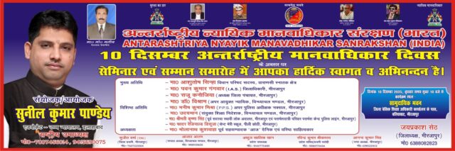 MIRZAPUR NEWS: अन्तर्राष्ट्रीय न्यायिक मानवाधिकार संरक्षण इकाई, मीरजापुर द्वारा प्रत्येक वर्ष की भांति इस वर्ष भी 10 दिसम्बर “विश्व मानवाधिकार दिवस” के पावन अवसर पर इस वर्ष भी 10 दिसम्बर 2025 दिन बुधवार को विशाल मानवाधिकार उत्सव एवं सम्मान समारोह का आयोजन मीरजापुर नगर के सामुदायिक भवन, बरिया घाट पर सुबह 11.30 बजे से आयोजित किया गया है। इस कार्यक्रम के मुख्य अतिथि स्नातक एम.एल.सी. आशुतोष सिन्हा, जिलाधिकारी, मीरजापुर पवन कुमार गंगवार, जिला पंचायत अध्यक्ष राजू कनौजिया एवं विन्ध्याचल मण्डल के अपर आयुक्त डॉ. विश्राम जी होगें तथा कार्यक्रम के विशिष्ट अतिथि मीरजापुर के अपर पुलिस अधीक्षक नक्सल मनीष कुमार मिश्रा एवं विन्ध्याचल मण्डल मीरजापुर के संयुक्त शिक्षा निदेशक उदयभान एवं परिवार परामर्श केन्द्र की सदस्या कृष्णा सिंह तथा सेन्ट मैरी स्कूल के प्रधानाचार्य फादर रेजिनाल्ड डिसूजा होगें। कार्यक्रम के अध्यक्षता प्रसिद्ध साहित्यकार भोलानाथ कुशवाहा जी करेंगे । कार्यक्रम में सम्मानित अतिथि के रूप में अन्तर्राष्ट्रीय न्यायिक मानवाधिकार संरक्षण नई दिल्ली के राष्ट्रीय उपाध्यक्ष सुनील कुमार पाण्डेय (एड.) उपस्थित रहेगें। कार्यक्रम में मीरजापुर के विभिन्न क्षेत्रों में योगदान देने वाले तथा मानवाधिकार के क्षेत्र में कार्य करने वाले लगभग 60 विभूतियों को सम्मानित करने का कार्यक्रम किया जायेगा । कार्यक्रम में “वर्तमान परिवेश में मानवाधिकार की उपयोगिता” विषय पर सेमिनाम का आयोजन किया जायेगा। उक्त कार्यक्रम की जानकारी अन्तर्राष्ट्रीय न्यायिक मानवाधिकार संरक्षण इकाई मीरजापुर के जिलाध्यक्ष जयप्रकाश सेठ जी ने प्रत्येक प्रेस एवं इलेक्ट्रानिक मीडिया कर्मियों को दिया ।