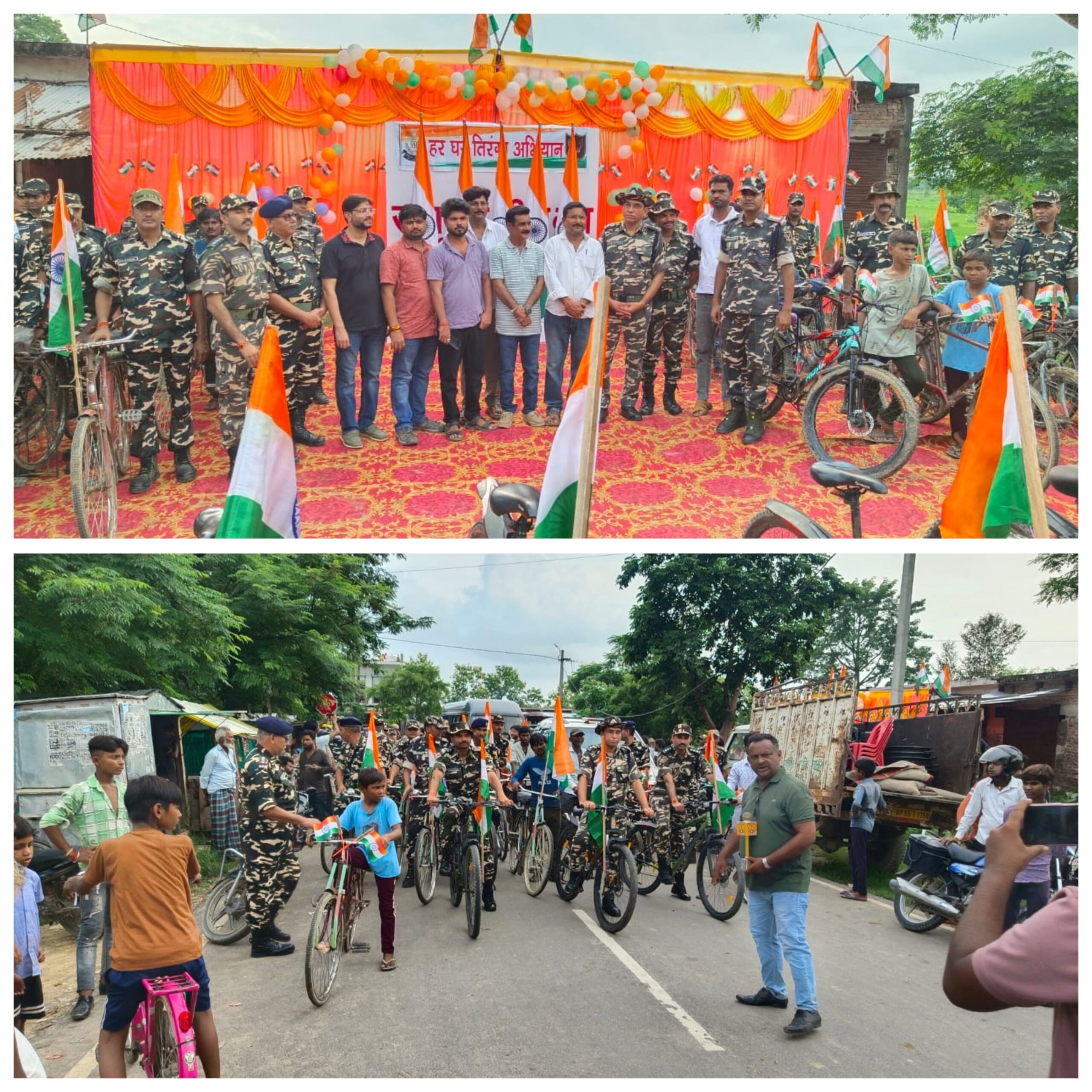 BALRAMPUR NEWS: कमाल खान(ब्यूरो प्रमुख) मंगलवार को कमांडेंट ,50वीं वाहिनी श्री संजय कुमार, स.सी.ब. ,बलरामपुर  के नेतृत्व में आजादी के अमृत महोत्सव के अंतर्गत *”हर घर तिरंगा”* कार्यक्रम का आयोजन समवाय त्रिलोकपुर चौराहे से किया गया, जिसके दौरान साईकिल फ्लेग रैली निकाली गई जिसमें वाहिनी के उप कमाडेंट सौरभ कुमार, सहायक कमांडेंट संजय के पी तथा त्रिलोकपुर कम्पनी कमांडर कुणाल कुमार ,अधीनस्थ अधिकारी , जवान , ग्रामीण , गुड्डू प्रधान ,सोनू प्रधान, पत्रकार एवं ग्रामीण बच्चों  ने बड़े ही  जोश के साथ रैली में प्रतिभाग किया l साइकिल रैली त्रिलोकपुर चौराहा से रवाना होकर बोर्डर गांव होते हुए मजगवां कलां, बिजुआ कलां , मजगवां खुर्द व बेलभरिया होते हुए त्रिलोकपुर समवाय में समापन किया गया।